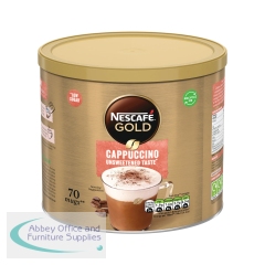 Nescafe Gold Cappuccino Unsweetend Taste Instant Coffee 1Kg 12405010. Made with roasted coffee beans. Contains whitener for a smooth and velvety drink. Add 3 heaped teaspoons into your mug, add hot water and stir. Makes approx. 70 mugs.
