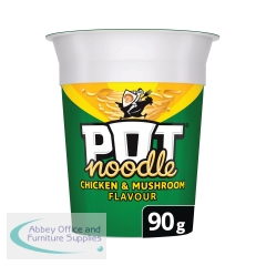 Pot Noodle Chicken and Mushroom 90g (Pack of 12) 67492342. Store in a cool, dry place. Suitable for Vegetarians. Contains Barley, Gluten, Milk, Soya and Wheat. May contain Celery, Egg and Mustard. Volume: 90g. Pack of 12.