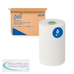 Scott Essential Rolled Hand Towel 350m White Pack of 6 FOC Dispenser. For wiping and drying. Airflex technology for superior absorbency. Compatible with Aquarius Rolled Hand Towel Dispensers.
