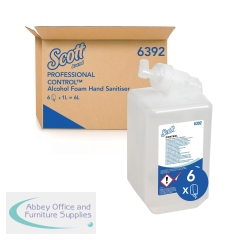 Scott Alcohol Foam Hand Sanitiser 1L Pack of 6 6392. Compatible with Aquarius hand cleanser dispensers. Provides easy coverage and visible application. Fragrance free. Contains 75 percent alcohol.