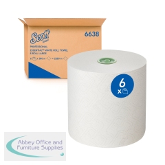 Scott Essential 1-Ply Hand Towels Roll E-Roll Large White (Pack of 6) 6638. Use with Kimberly Clark Professional ICON dispensing system (53691/53940). Airflex Technology for effective absorbency. Embossed. 100% recyclable. Roll dims: (L)380m x (W)191mm.
