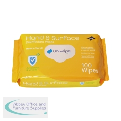 Uniwipe Hand and Surface Wipes (Pack of 100) 1025. Dual action cleaner and disinfectant wipes. Alcohol free and gentle on surfaces. Passed and exceeds EN13727, EN1276, EN14476, EN16777, EN16615. Z-fold dispensing. Wipe size: 220x165mm.