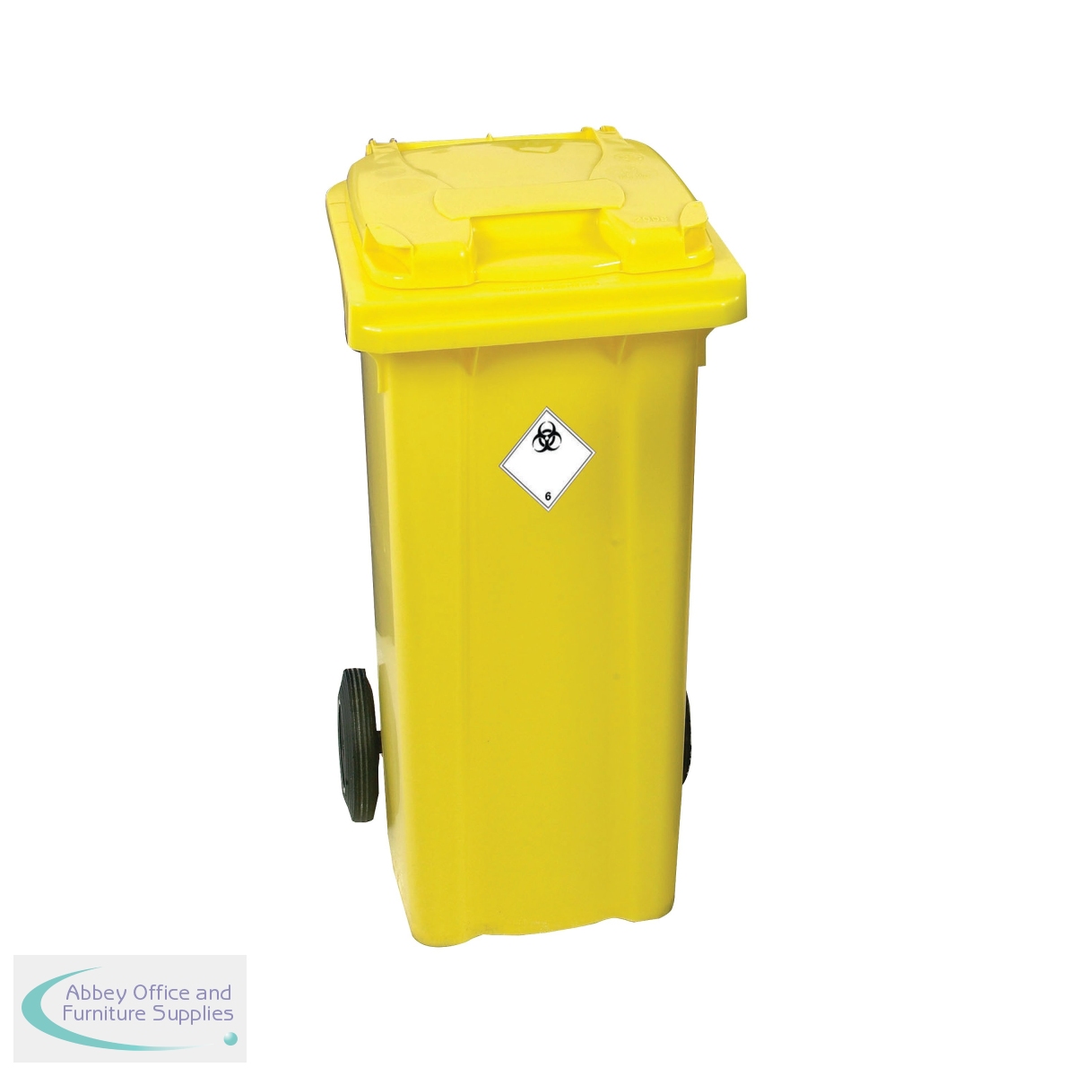 This clinical waste bin is resistant to acid and alkali corrosion and UV light. The lid is lockable to maintain hygiene standards and to keep contents protected from tampering. The bright yellow plastic design features the internationally recognised biohazard symbol printed on the front as a warning. Disposing of clinical waste in this refuse container reduces the risk of exposure to harmful materials. This 120 litre bin has 2 wheels for ease of mobility.