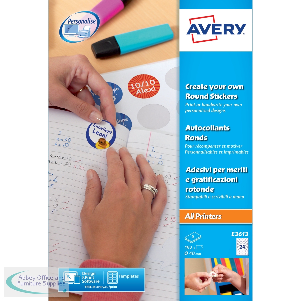 Designed to reward and motivate, these Avery stickers can be personalised for individuals using Avery templates, and are perfect for use in the classroom or at home. Suitable for use in both laser and inkjet printers, these round, white stickers are 40mm in diameter. Print or handwrite a different message on each sticker as you require. This pack contains 8 A4 sheets, with 24 stickers per sheet (192 stickers in total).