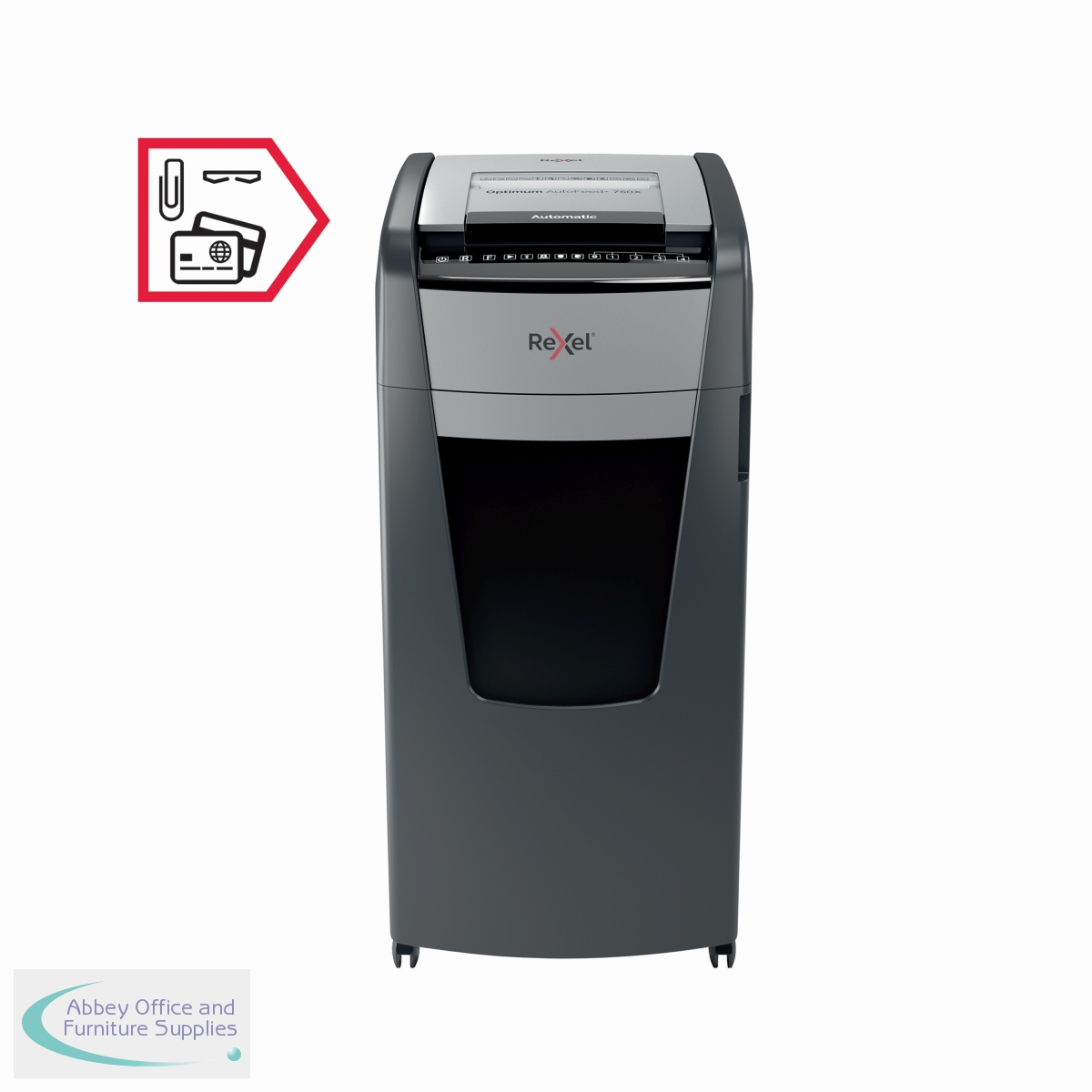 Rexel Optimum AutoFeed+ 750X cross-cut shredder automatically shreds up to 750x A4 sheets of paper (80gsm) at a time, into P-4 (4x30mm) cross-cut pieces. This auto feed shredder machine is a sophisticated office shredder, featuring a 140L pull out bin. The auto-feed removes the need to manually feed paper, and with the capability to accept staples and paper clips, the tedious process of manual removal is also unnecessary. Key Features