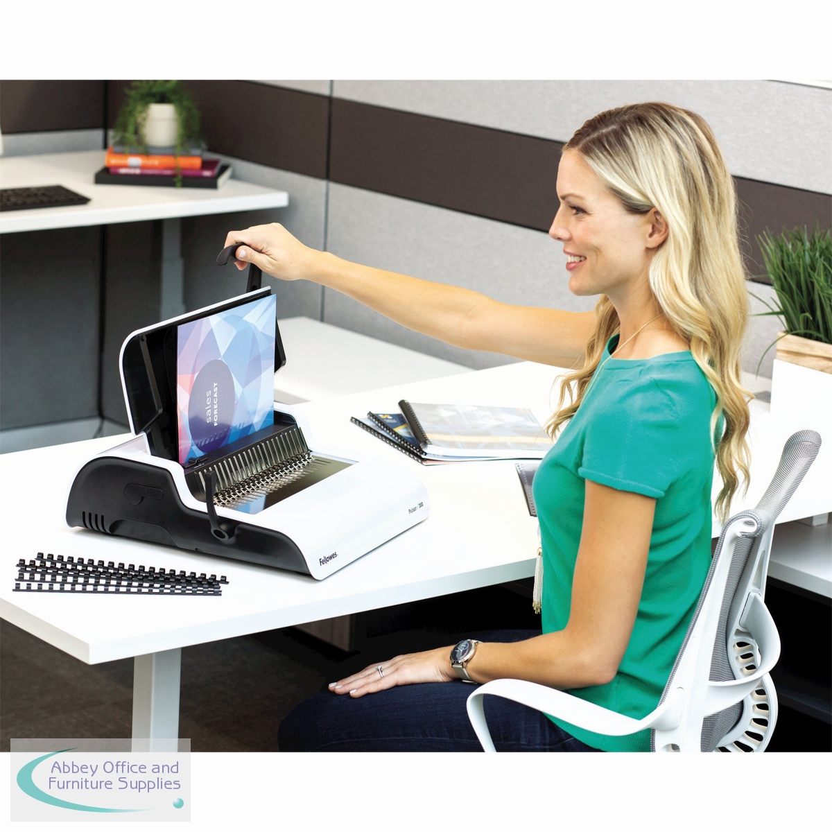 An ideal small office binder for presentations, professional documents and proposal documents, this Fellowes Pulsar A4 binding machine includes a starter kit so that you can start binding straight away. The 15 sheet punch capacity can handle portrait or landscape A4 documents, or landscape A3 sized documents, while the chip tray's burst out feature will eliminate the possibility of any jams. Once punched, the binder can handle up to 300 sheets at once for neat and professional bound documents.