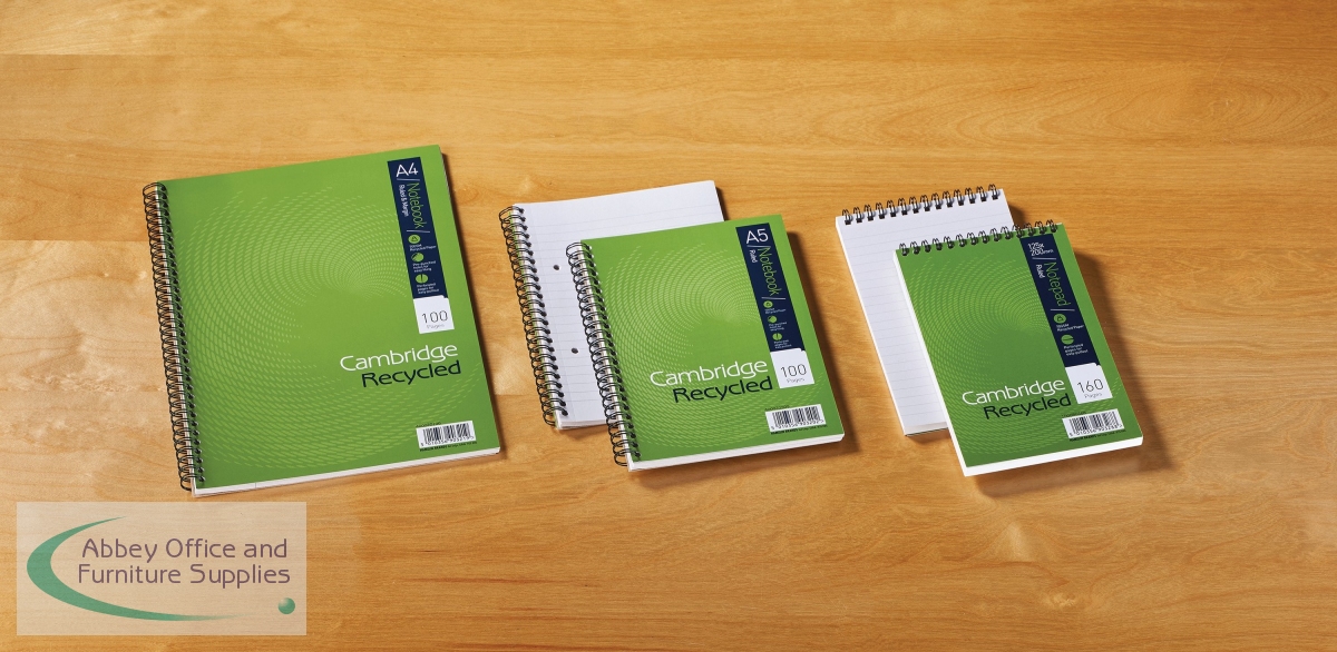 This environmentally friendly Cambridge notebook contains 100 pages of 100% recycled 70gsm paper, which is feint ruled for neat note-taking. The pages are micro-perforated for easy removal and 4 hole punched for filing in a ring binder or lever arch file. The wire binding allows the notebook to lie flat for easy note-taking. This pack contains 5 x A4 notebooks.