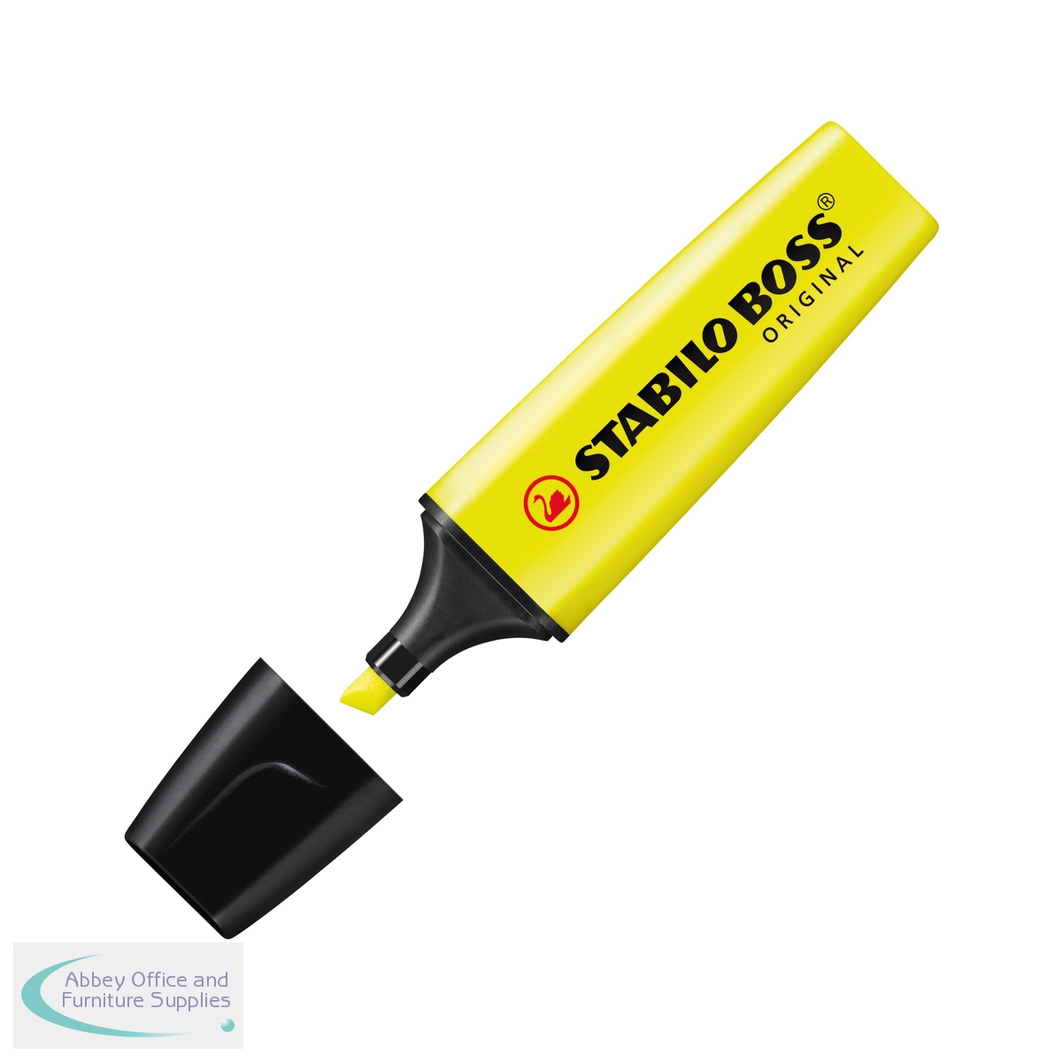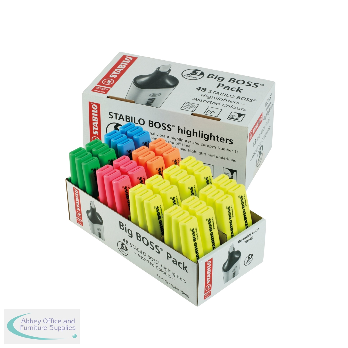 The Stabilo Boss Original is Europe's best selling, most popular highlighter. With its distinctive shape and ultra fluorescent colours, it is a high quality highlighter that writes further, lasts longer and will not dry out. The wedge shape tip can be used to draw broad and fine lines, making it perfect for highlighting, underlining text and even colouring. The Anti Dry Out Technology means the cap can be left off for up to 4 hours and the super bright colours will not fade. This pack contains 24 yellow, 6 orange, 6 pink, 6 Green and 6 blue highlighters.
