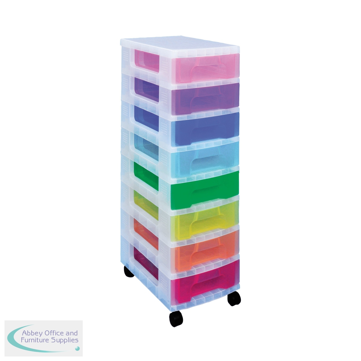 A great storage solution, this Really Useful Multicoloured Storage Tower is perfect for storing a multitude of items. The main unit contains 8 removable and interchangeable drawers, each with a capacity of 7 litres and manufactured in brightly coloured transparent plastic. Supplied with removable castors for ease of use. Storage tower, a versatile and vibrant addition to your storage needs.