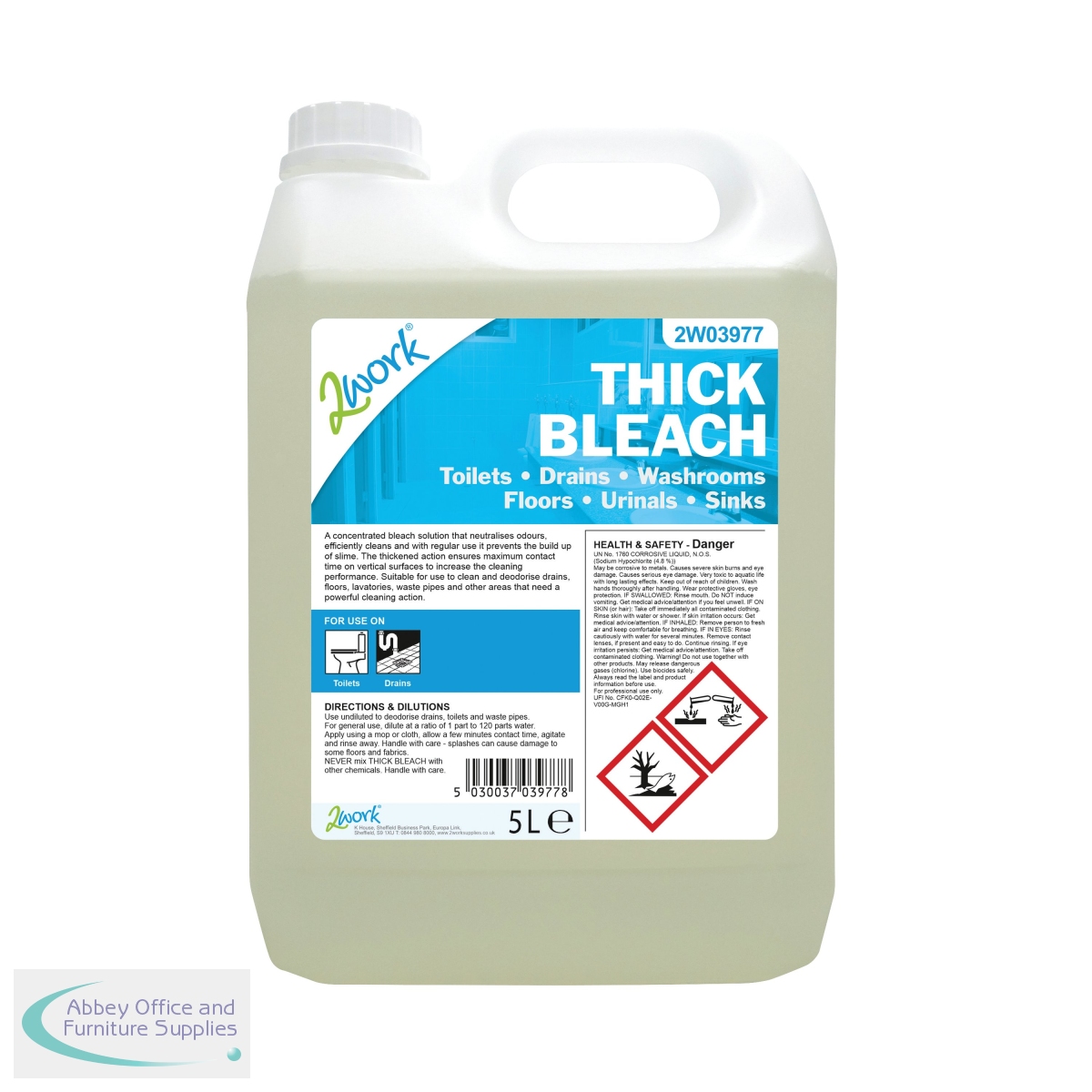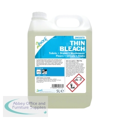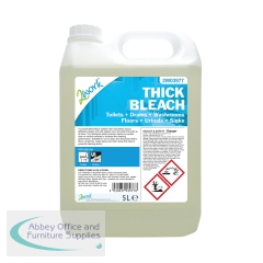 This 2Work Thick Bleach features a concentrated, thickened formula, which clings to vertical surfaces for an effective clean. The bleach solution neutralises odours and helps to prevent the build up of slime on drains, floors, lavatories, pipes and other surfaces. Dilute at a ratio of 1:20 for general cleaning, or use undiluted on toilets, drains and pipes. This pack contains 1 x 5 litre bottle.