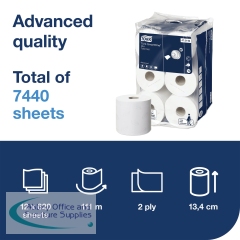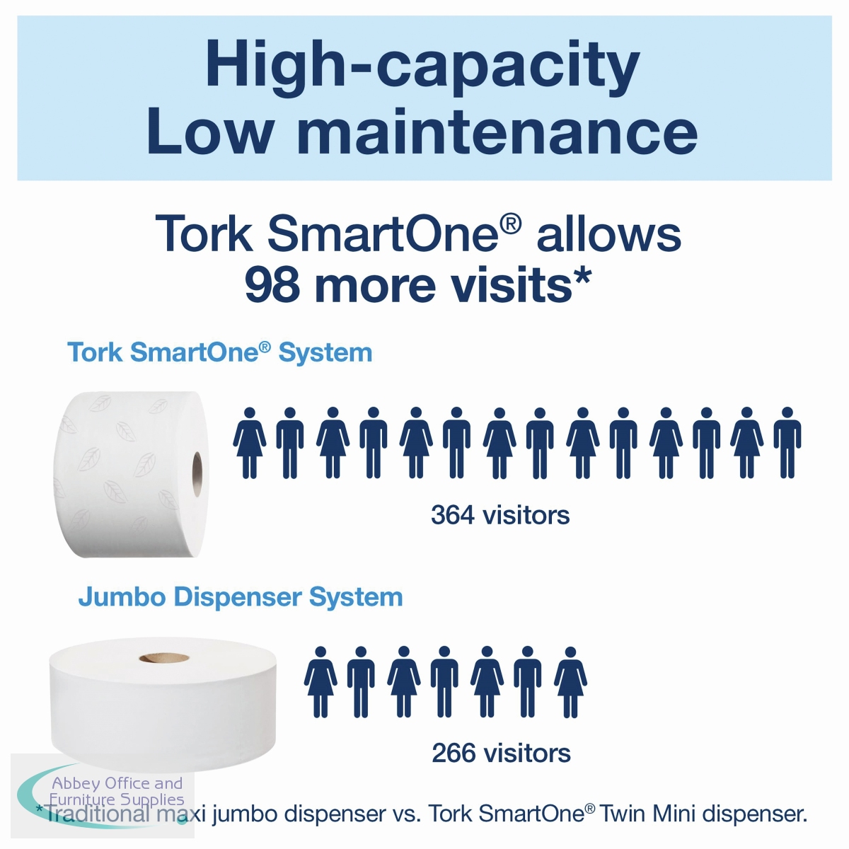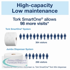 Designed for SmartOne Mini Twin dispensers, in spaces with low, medium or high traffic, this pack of twelve toilet rolls is the ideal choice for a hygienic washroom. Each roll in this pack has over 100 metres of high quality 2-ply toilet tissue featuring a SmartCore core for simple refilling. The single sheet dispensing system cuts use by up to 40% compared to traditional jumbo toilet roll dispensers, lowering consumption and costs. These rolls are environmentally friendly, made from 75% recycled paper which disintegrates quickly for reduced maintenance.