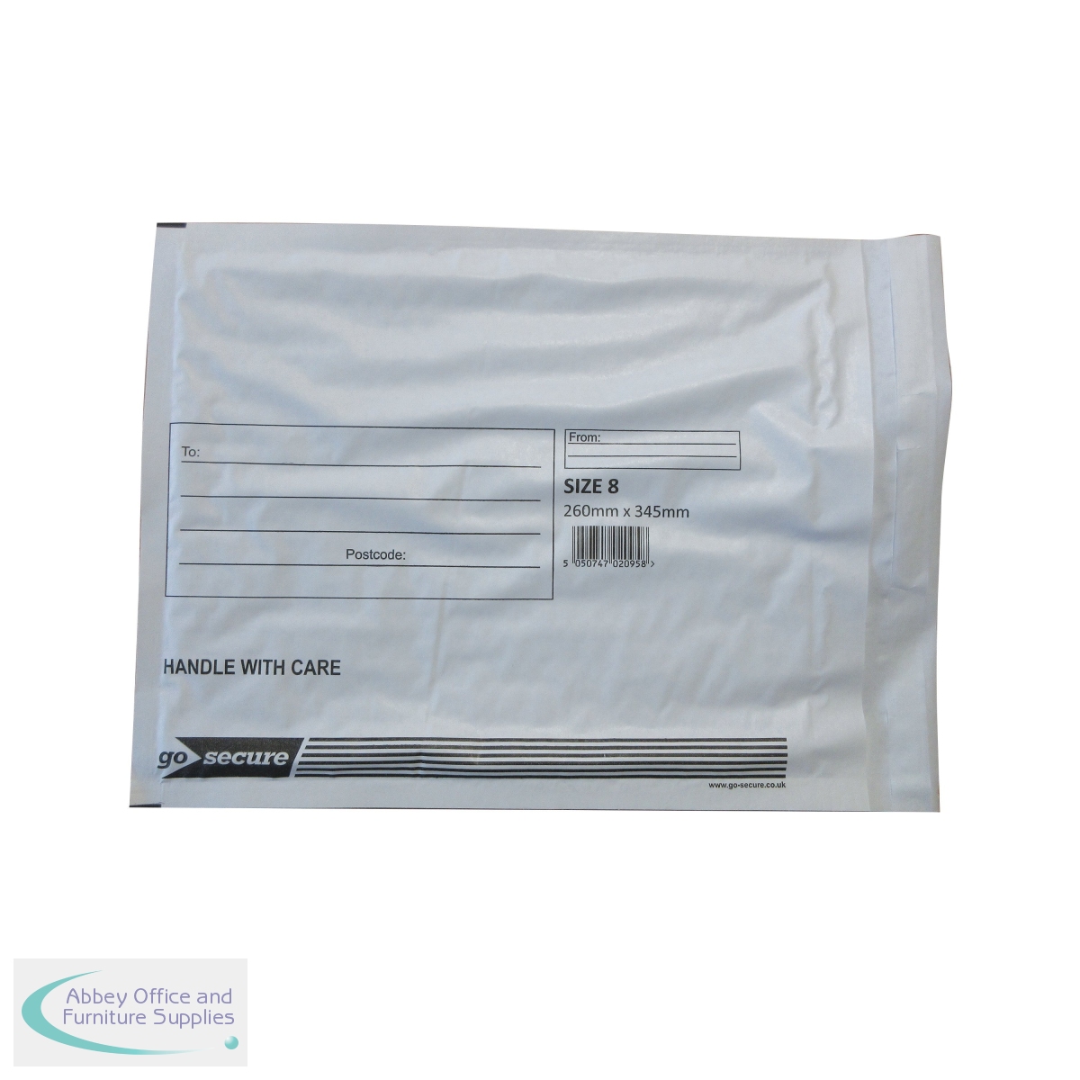 Lightweight and economical, these GoSecure bubble lined envelopes are designed to be impact resistant. With a bubble lined interior and an exterior made from 75gsm MG grade paper, these envelopes are ideal for protecting delicate or fragile items in transit. Featuring a sender address box and a secure peel and seal closure, these size 8 white envelopes measure 260 x 345mm (internal size) and come in a pack of 50. The bubble that inner lines the mailers is produced using a minimum of 30% recycled content.