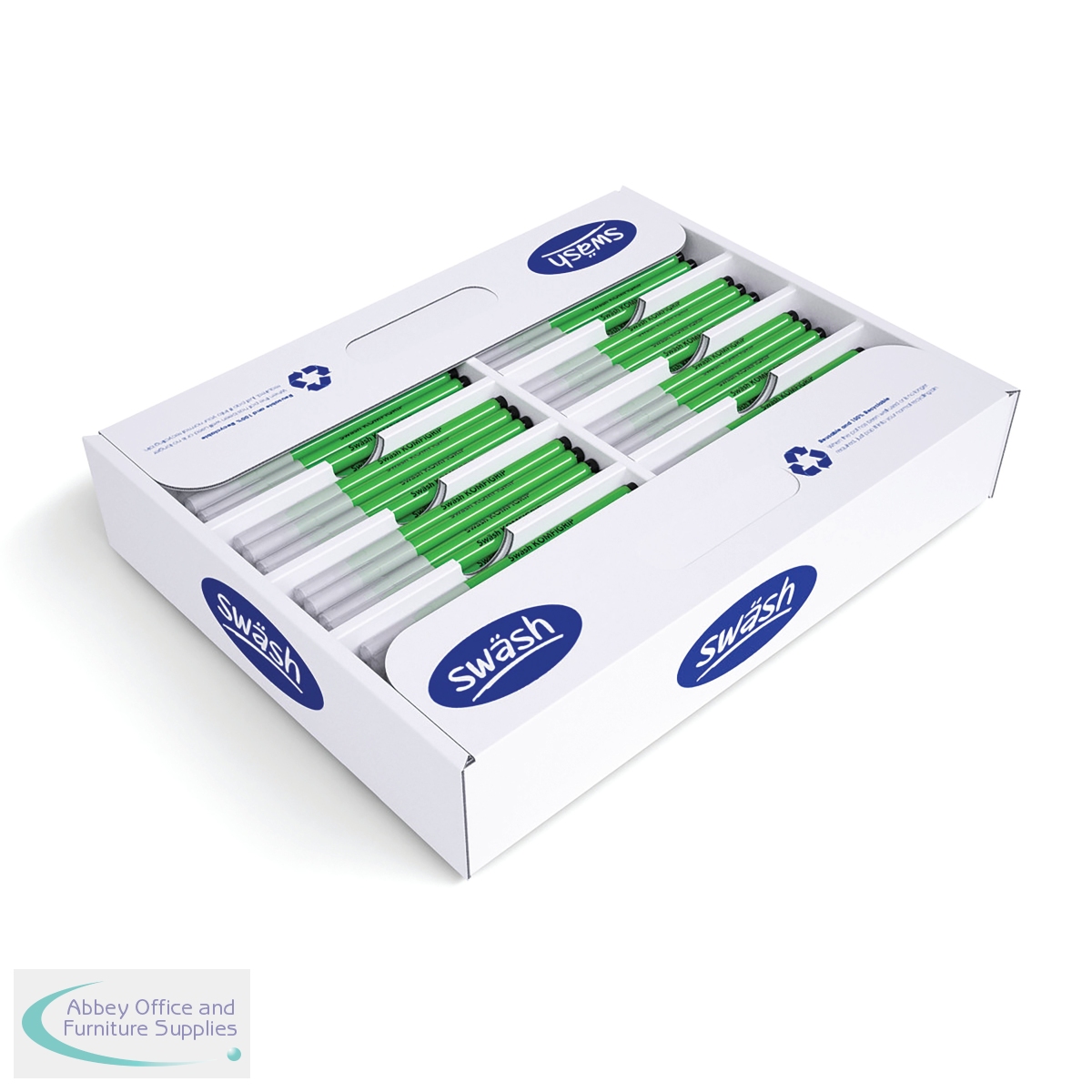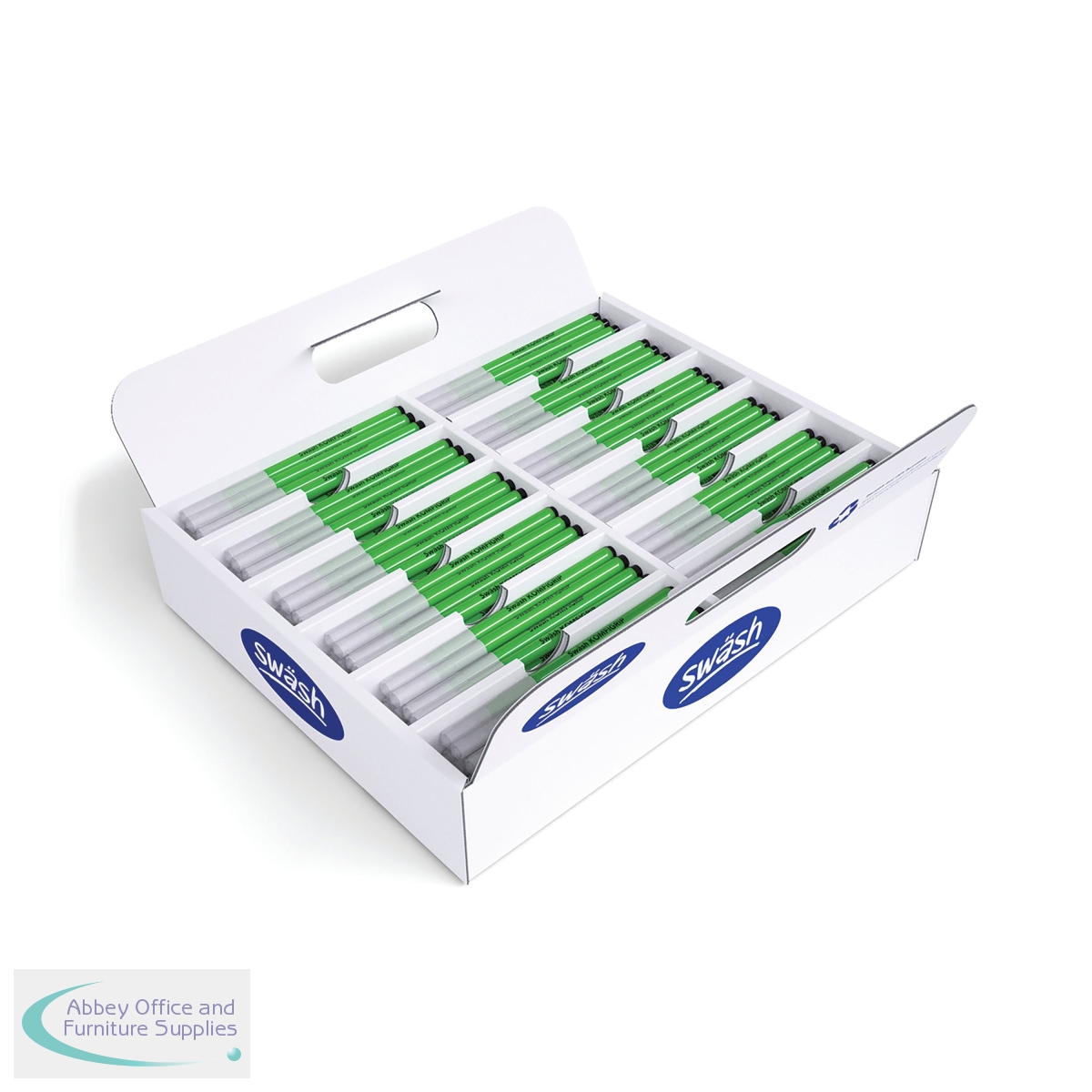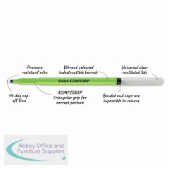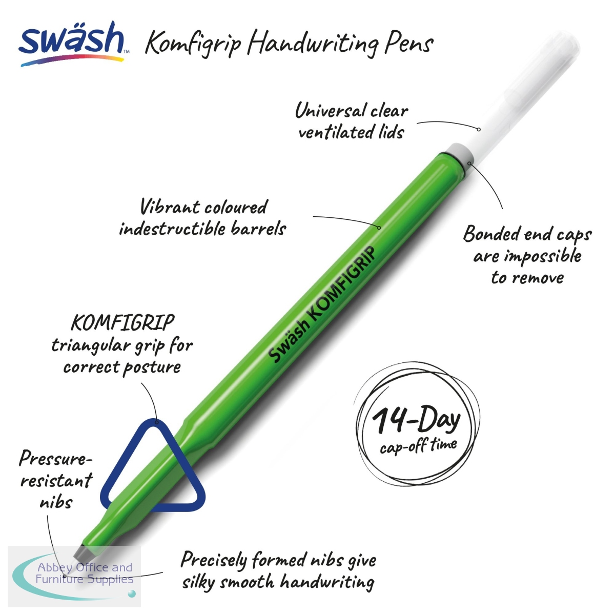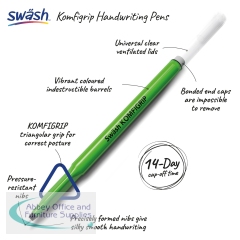 Aid and improve handwriting for both left and right-handed users with Swash KOMFIGRIP handwriting pens. Each pen benefits from: a triangular grip to encourage the correct writing posture, a hard-wearing, pressure-resistant tip, and a universal clear, ventilated lid. The slim barrel is easy for small hands to hold and control, and the ink is rapid drying with virtually no bleed-through - ideal for left-handed users! The impressive 14-day cap-off time prevents drying out, which makes these pens last even longer in the busy classroom environment. Pack contains 300 handwriting pens, supplied in an 80% recycled corrugated card tray that easily fits into most classroom trays. (not supplied).