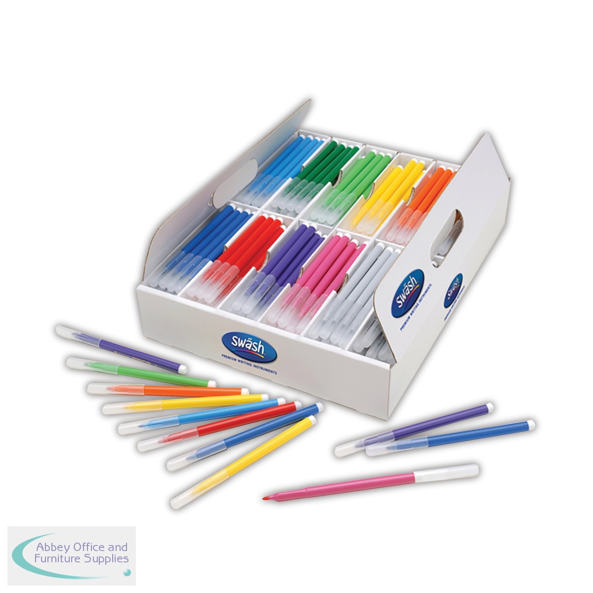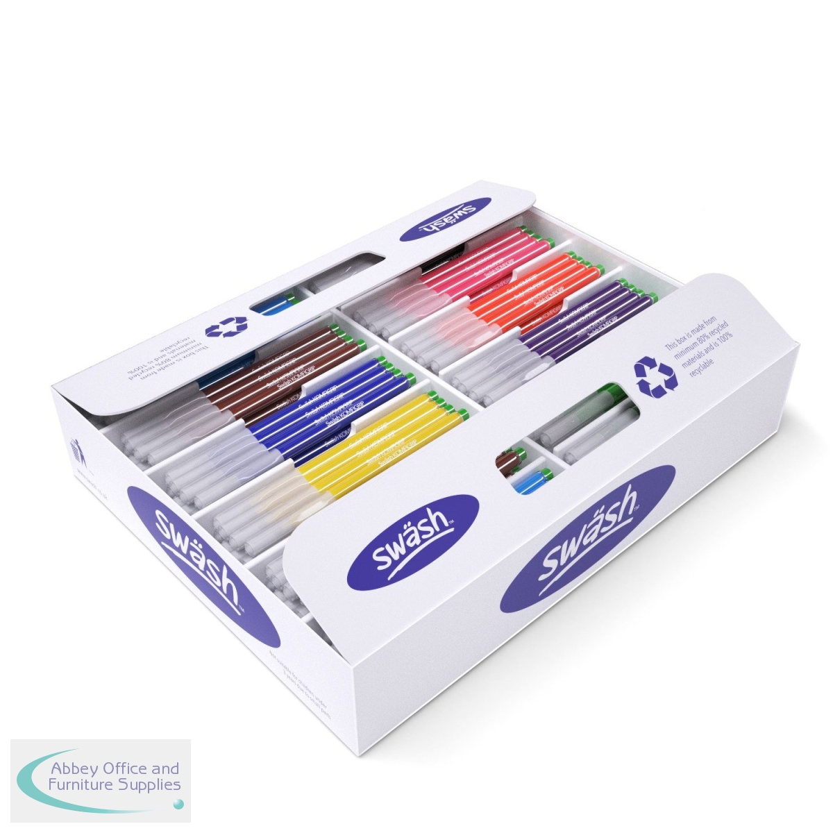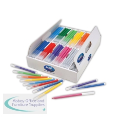Swsh KOMFIGRIP colouring pens have triangular grips to encourage correct writing posture, with superwashable ink and an impressive 3 day cap-off time to prevent drying out. The lids are universal, clear and ventilated, and each pen has a strong barrel and bonded end caps. This class tray of 300 fine tip pens is presented in a compartmentalised cardboard display box to keep the colours organised.