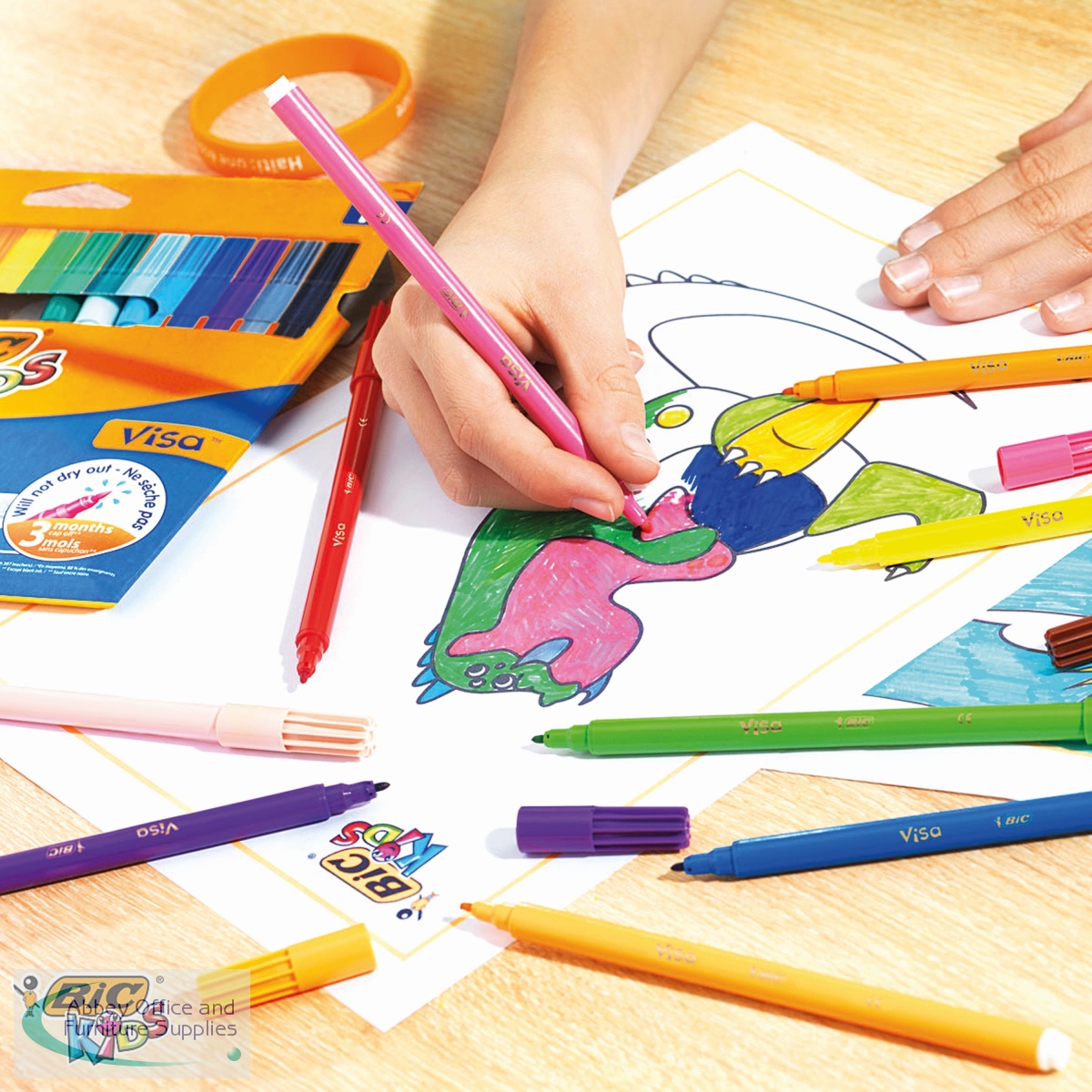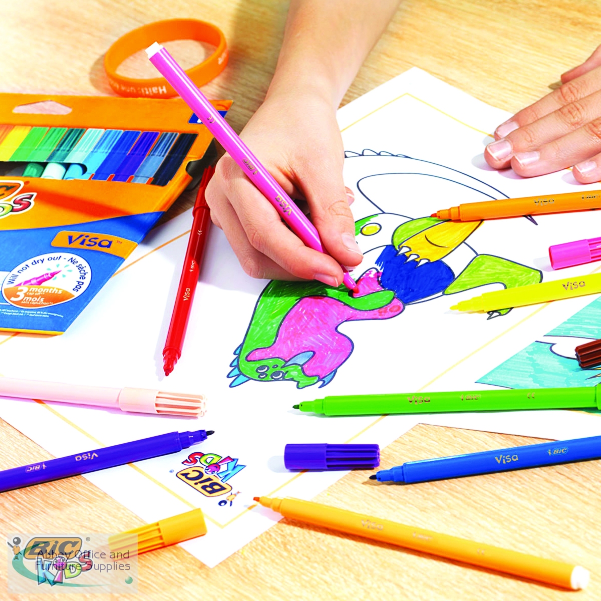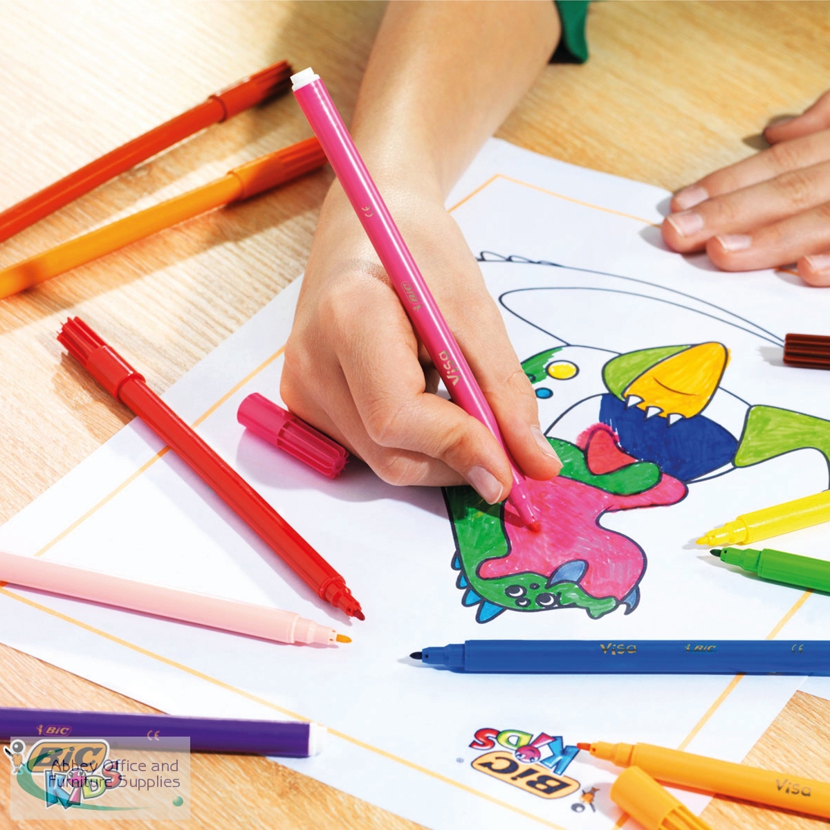 Ideal for classroom use, these Bic Kids Visa Felt Pens feature a fine tip for drawing and colouring. The pens contains water based ink, which is washable from most fabrics. This class pack contains 144 felt pens in vibrant assorted colours.
