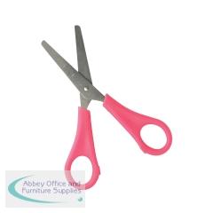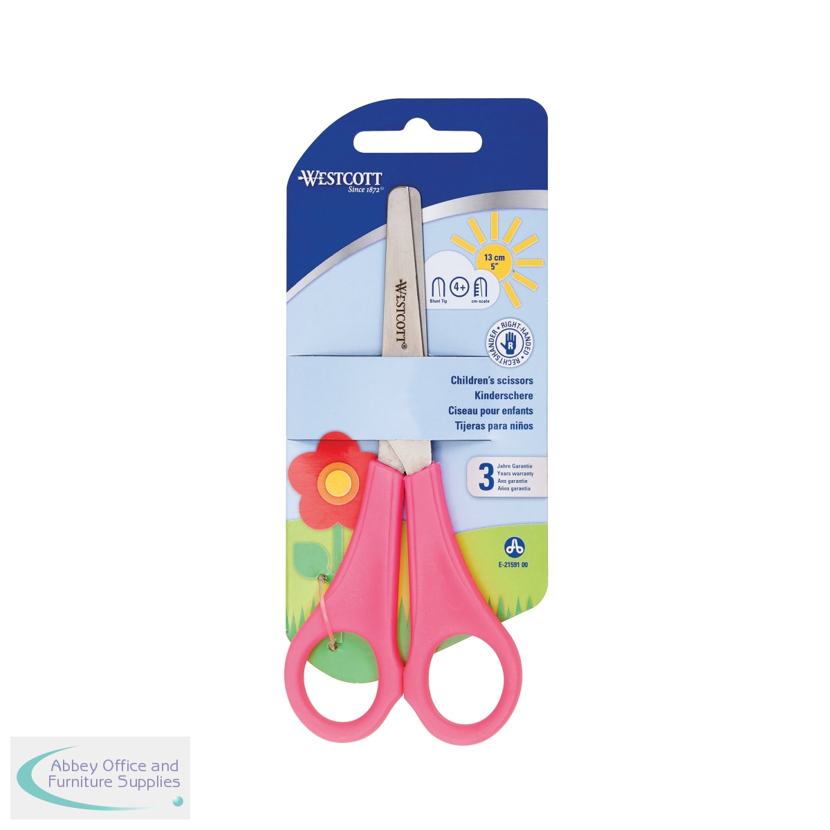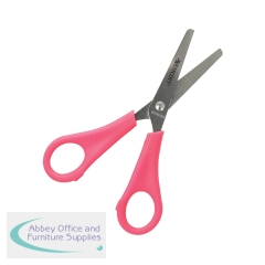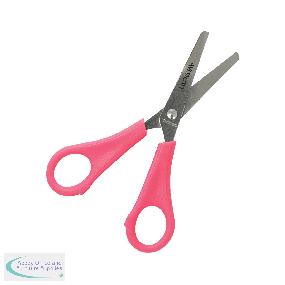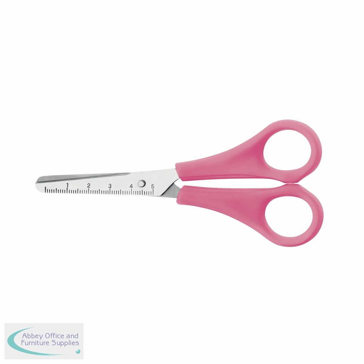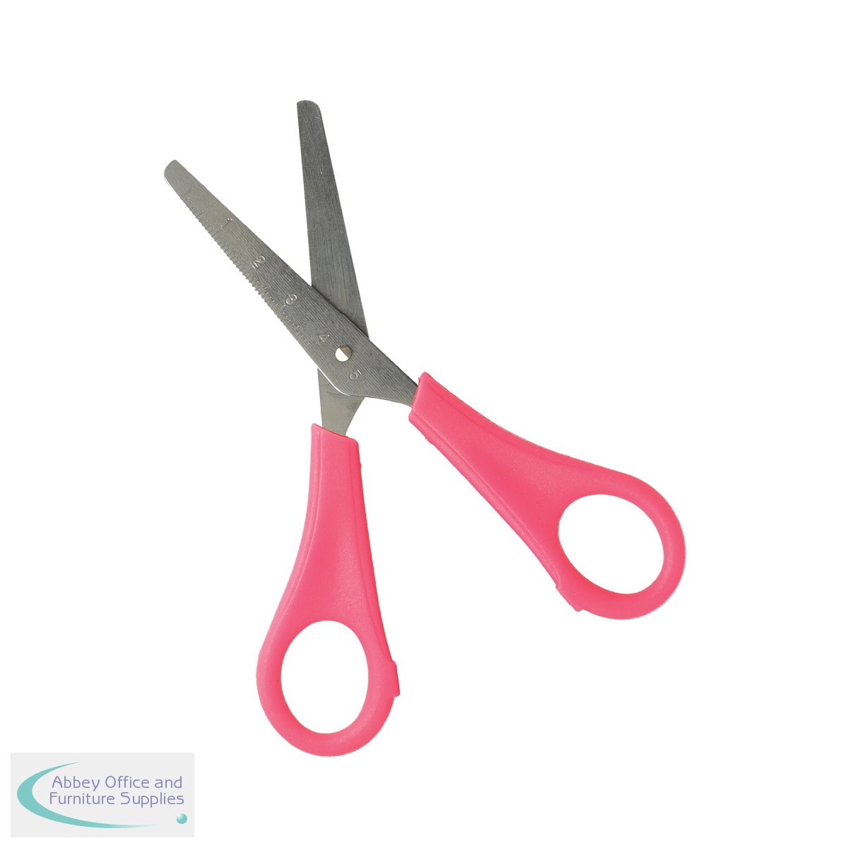 These great value scissors from Westcott have a rounded, blunt tip for extra safety. The stainless steel blades include a centimetre scale, pink plastic handles and are for right handed users. Ideal for use in school classrooms, these scissors are great for arts and crafts use for children aged 4 and over. This pack contains 12 pairs of scissors.