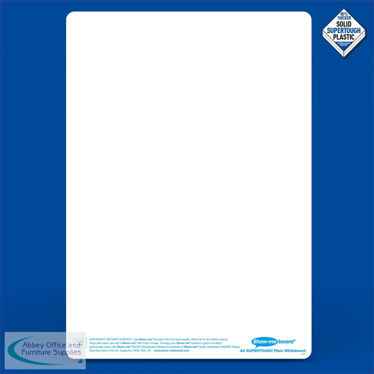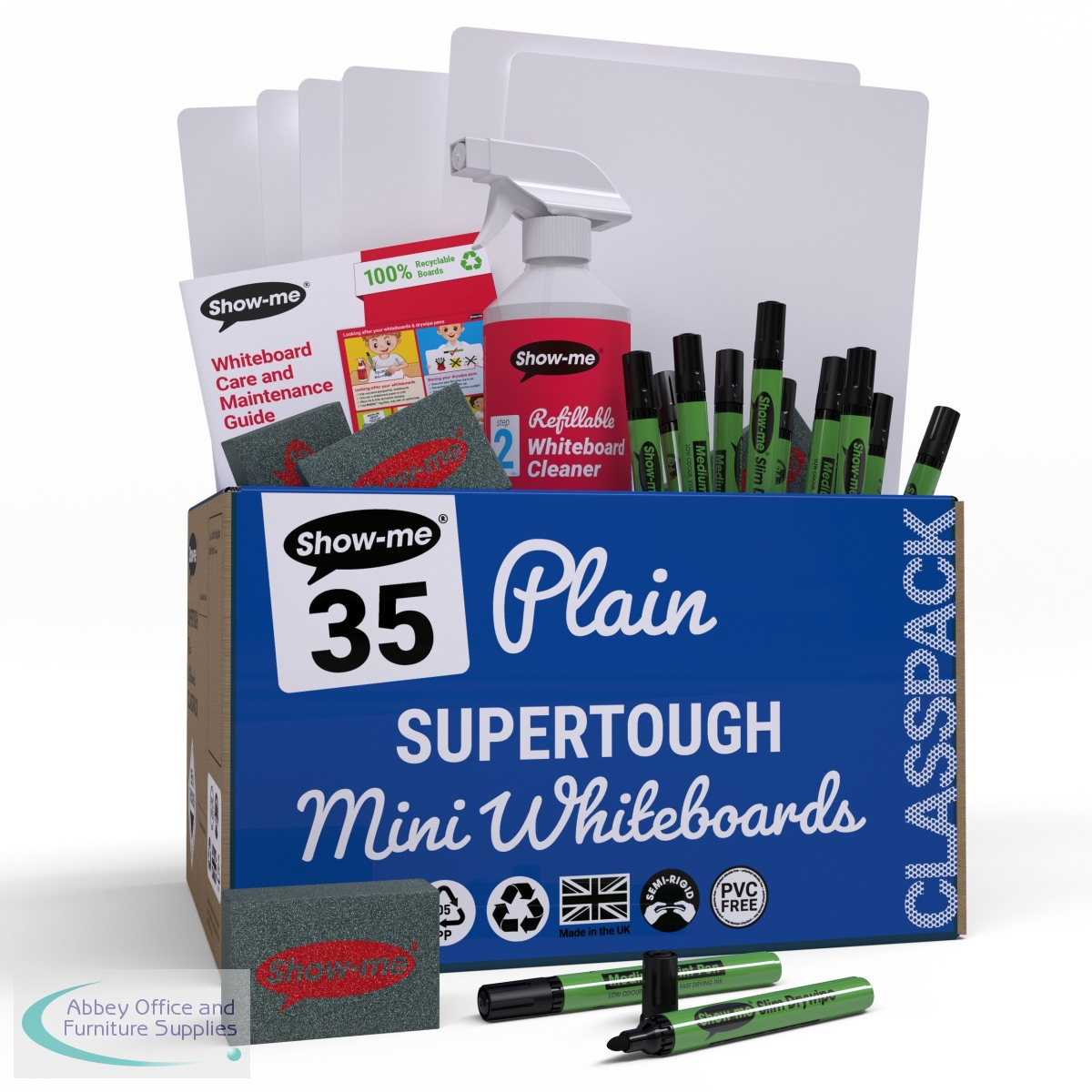 Write, draw, work out, record and mind map anything and everything both in and out of the classroom with SUPERTOUGH plain Show-me boards. Take learning on the move with Show-me SUPERTOUGH boards. At 85% thicker than a standard Show-me board, they're ideal for working on the floor, in playgrounds, on field trips and more. Every board has an ultra-smooth, glossy surface for optimal erasability. All Show-me boards made since 2014 are made from Polypropylene, making them 100% recyclable at the end of their lifespan. Simply pop into your usual recycling bin! Classpack contains 35 each of boards, markers and erasers, a free bottle of Show-me Magix, and a whiteboard care and maintenance guide/ poster.