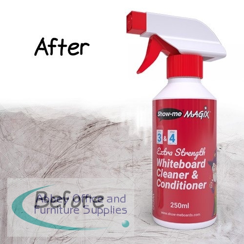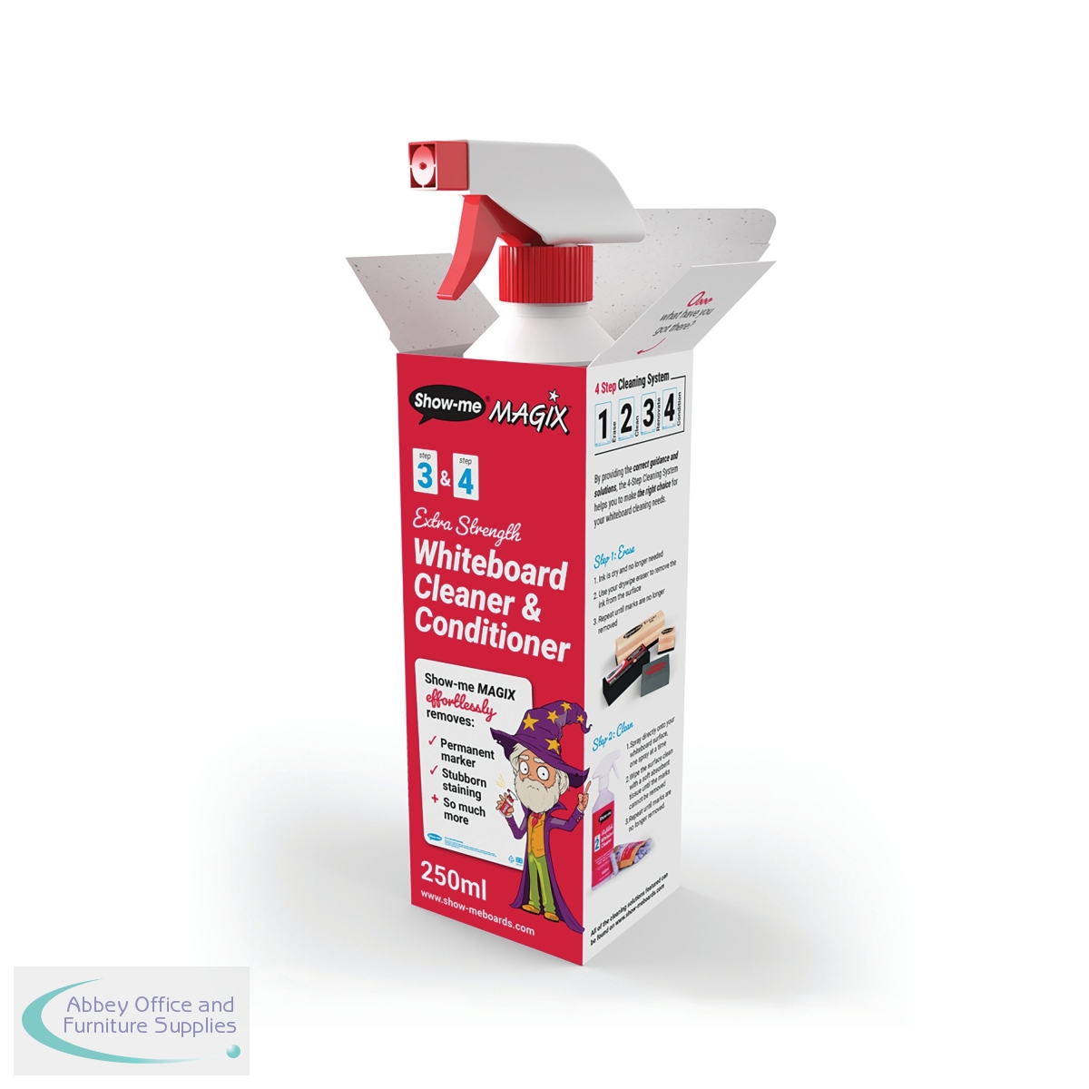 Never have dirty whiteboards again with Show-me MAGIX Whiteboard Renovator and Conditioner. Ideal for use on wall-mounted and individual drywipe boards, it's two products in one. Each application effortlessly removes ghosting, stubborn staining, ballpoint ink and permanent marker with ease. The unique STAYCLEAN ingredient adds a conditioning microfilm layer, which improves the erasability and gives a far smoother writing experience. This is not recommended for regular cleaning - choose Show-me Stage 2 cleaner for this. Pack contains 1 x 250ml trigger spray bottle of Show-me MAGIX.