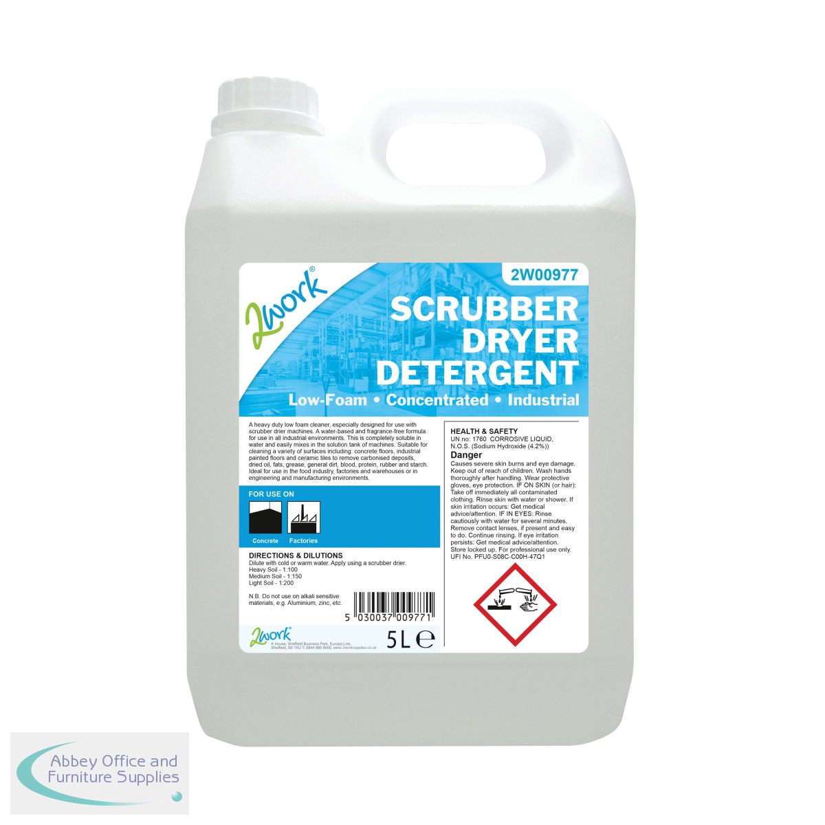 This 2Work Scrubber Dryer Detergent Foam works with floor cleaning machines to remove dirt and leave floors shining. A heavy duty low foam cleaner, this detergent is water-based and fragrance free, making it suitable for a variety of floors. Can be used on concrete and painted floors to remove carbonised deposits, dried oil, fats, grease, general dirt, blood, protein, rubber and starch. Supplied in a 5 litre bottle.
