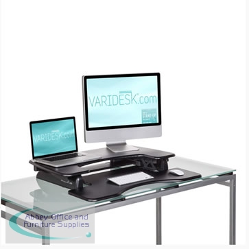 VARIDESK Pro Plus is the perfect size for workstations with dual monitors or docking stations.