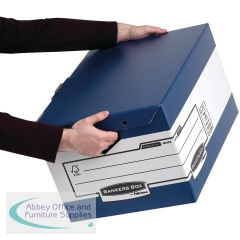 This Fellowes Bankers storage box features a triple layer of board on the end panels and a double layer on the sides and base, for durable, long lasting use. The boxes are supplied flat and feature time saving FastFold automatic assembly. The ergonomic handles are engineered at a 30 degee angle to reduce wrist strain when carrying. Each product is made from 100% recycled board.