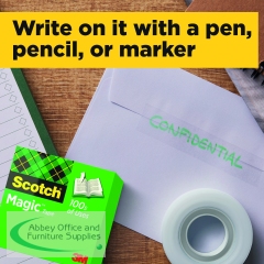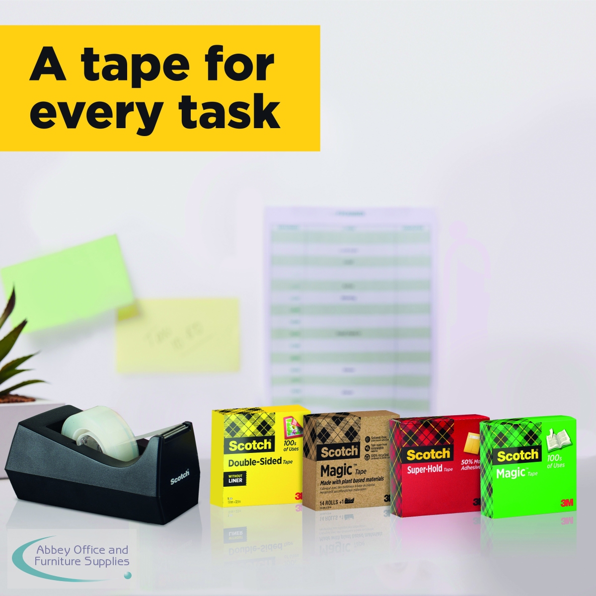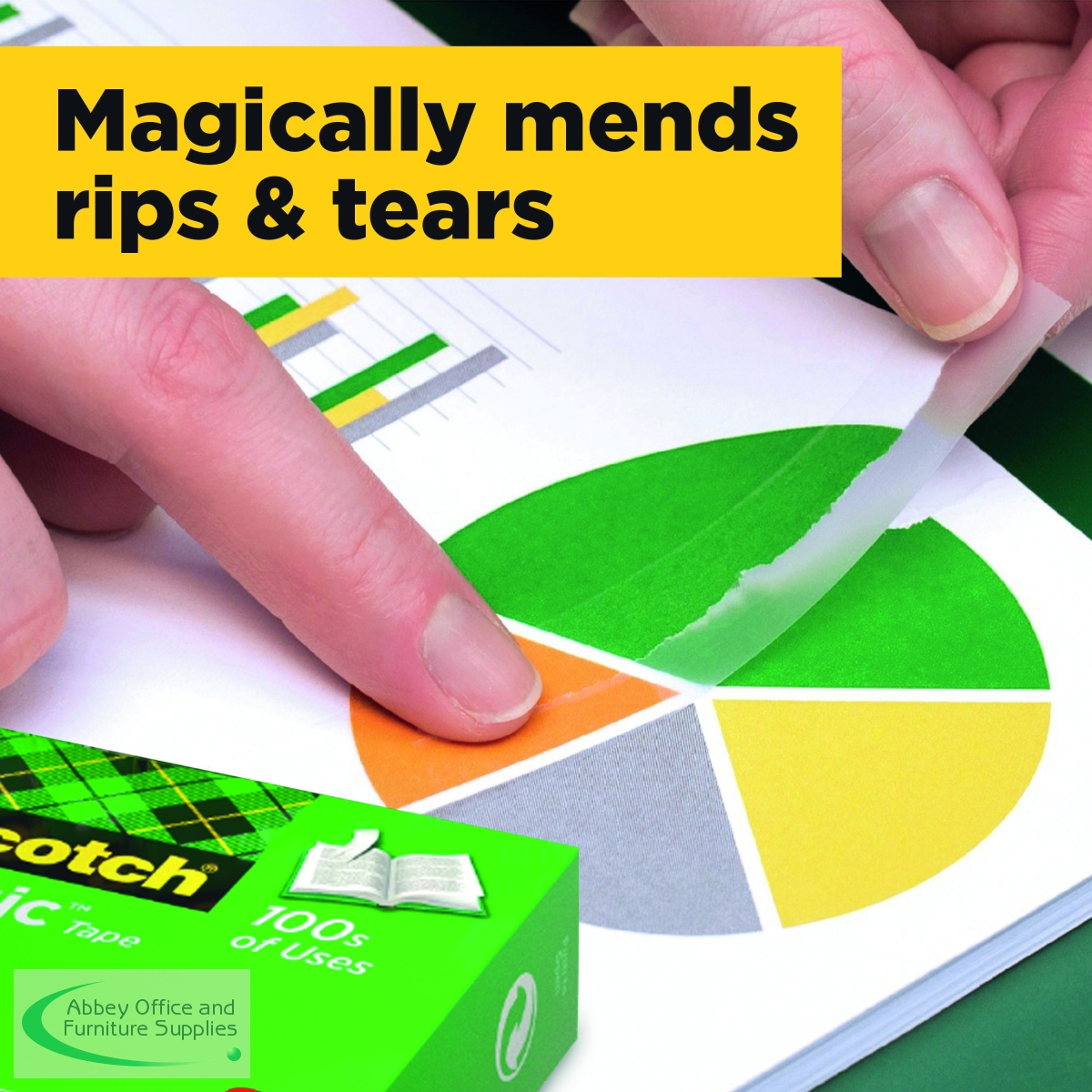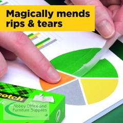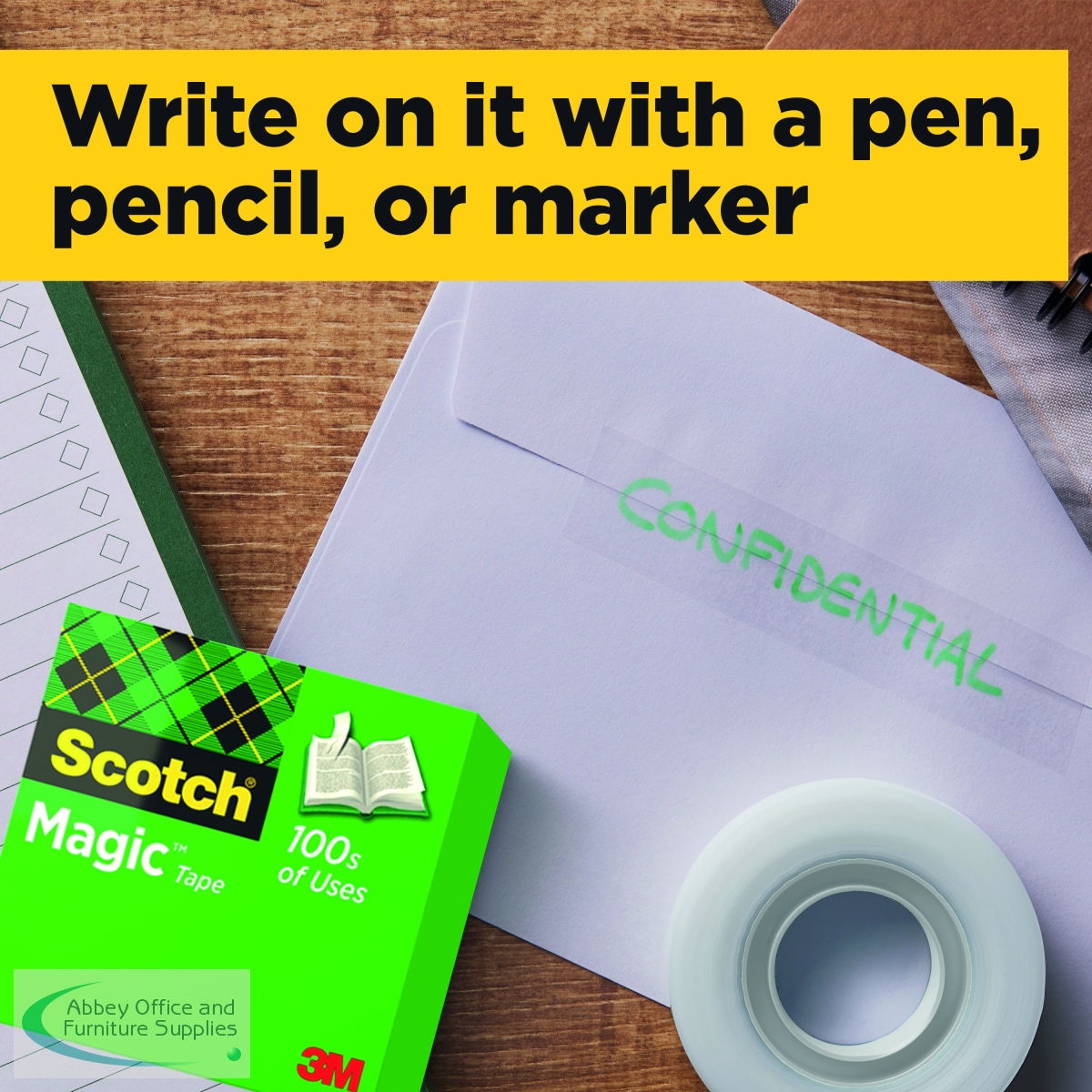Scotch Magic Tape is a long lasting, solvent-free tape that is designed not to yellow or dry out with age. Virtually invisible when applied, this tape is perfect for making repairs to torn paper, or wrapping packages attractively. The matte surface can be written on, which is ideal for adding labels or notices to parcels. This tower pack contains 8 rolls of tape measuring 19mm x 33m.