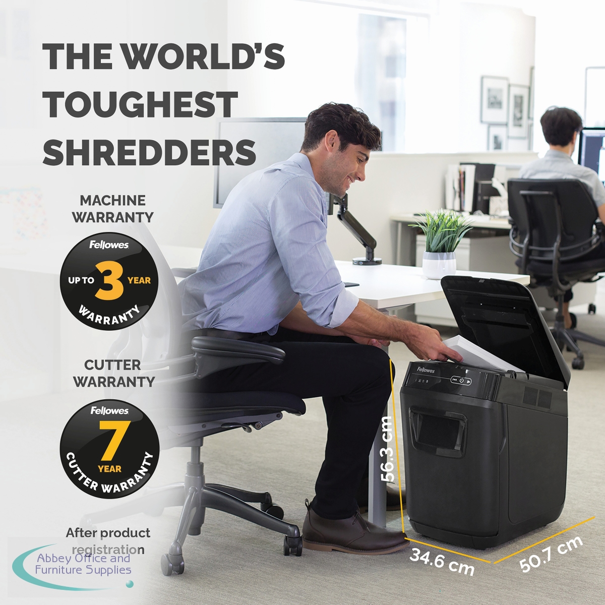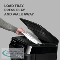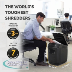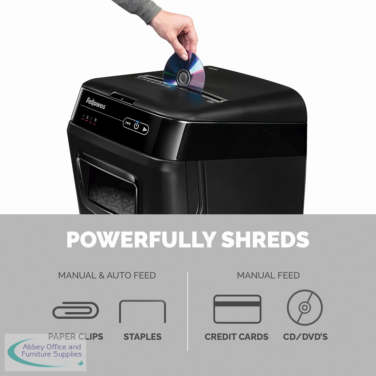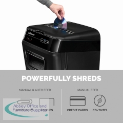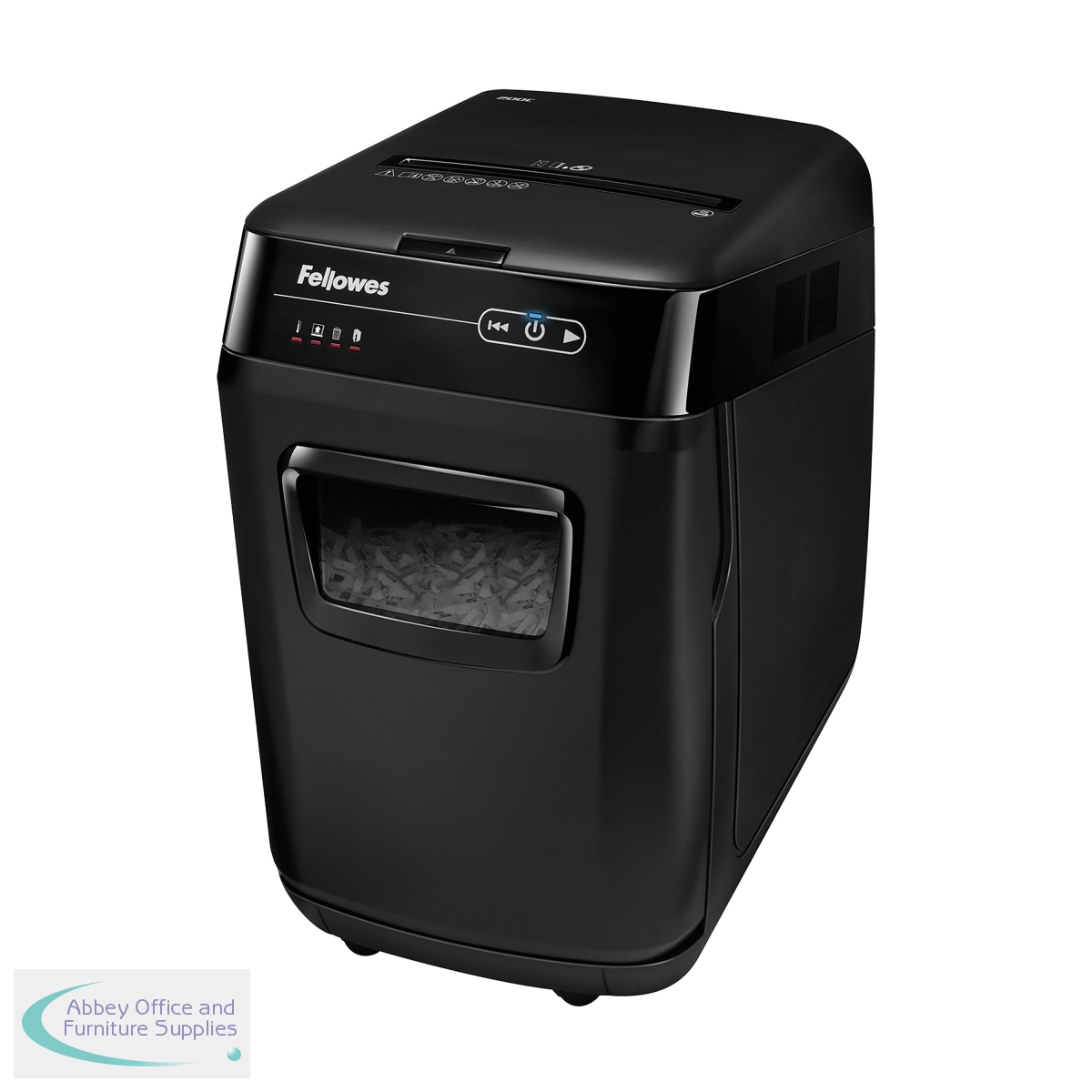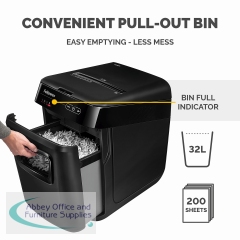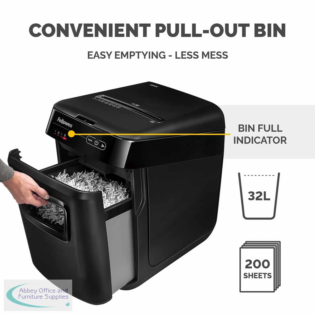 This efficient, high capacity Automax cross cut shredder from Fellowes will shred up to 200 sheets of 70gsm A4 paper into 4x38mm particles at a high security level of P-4. The machine will also shred staples, paper clips, credit cards, CDs, DVDs and Blu Ray discs for convenience in use. The shredder will safely enter sleep mode when not in use and has a 32 litre, easy to empty pull out bin.