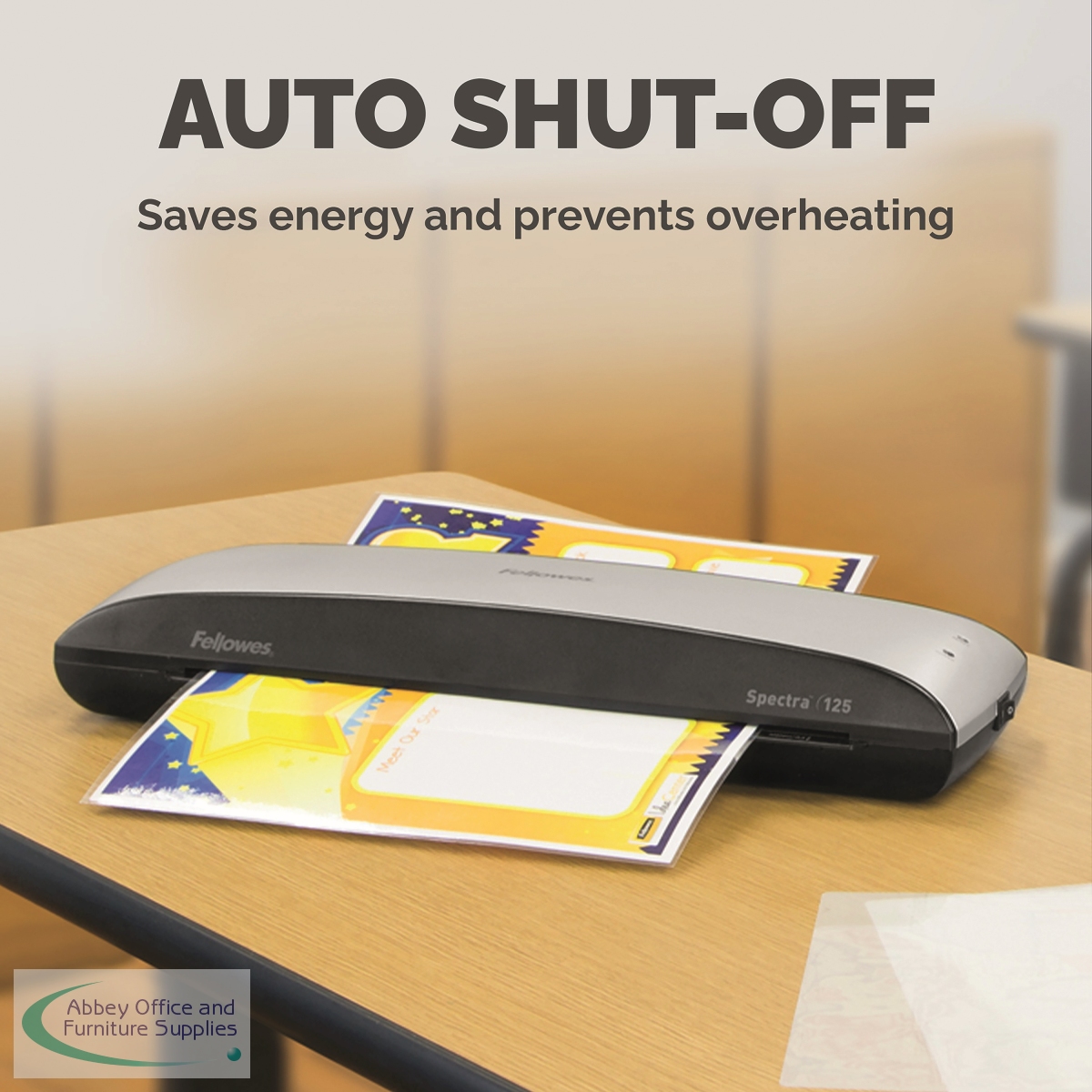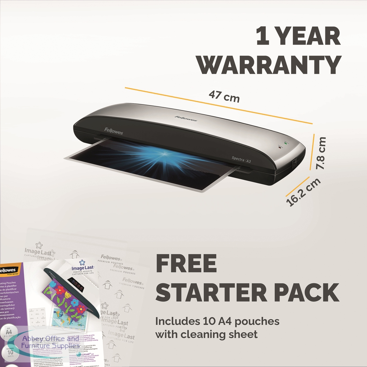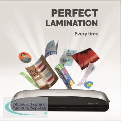 User friendly and designed for moderate use in home and office environments, the Spectra A3 Laminator from Fellowes is ideal for use with important and often handled documents. Taking only 4 minutes to warm up, the Spectra will laminate documents of up to 125 microns, is supplied with a handy release lever to disengage the pouch in the event of a misfeed and is fitted with an environmentally astute sleep mode which activates after 30 minutes of inactivity. Includes a 10 pouch laminating starter kit.