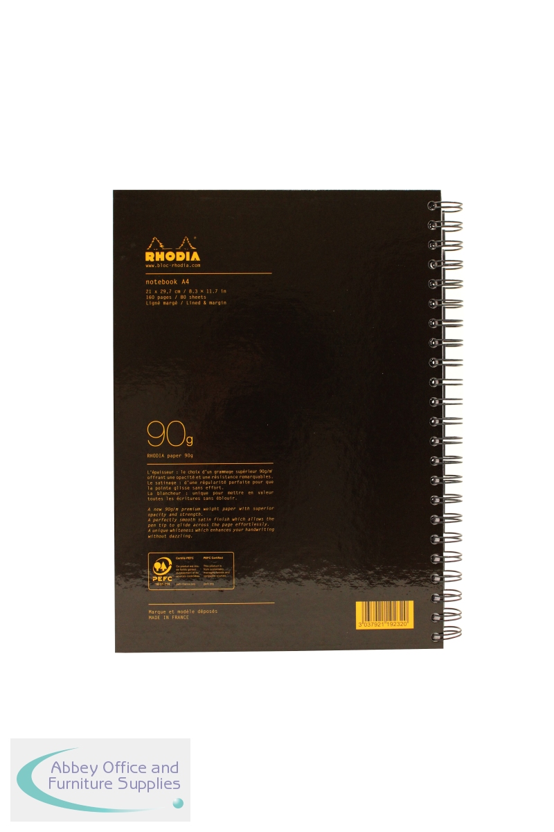 This Rhodia A4 wirebound business book is a sleek and professional business notebook. Part of the Rhodia Business Collection, this notebook features 160 pages made of brushed vellum paper for optimal writing quality. The 90gsm paper is feint ruled with a margin and designed for minimal bleed-through of ink for optimum use. The notebook is wirebound, allowing it to lie flat for ease of use, with durable hardback covers. This pack contains 3 black A4 notebooks.