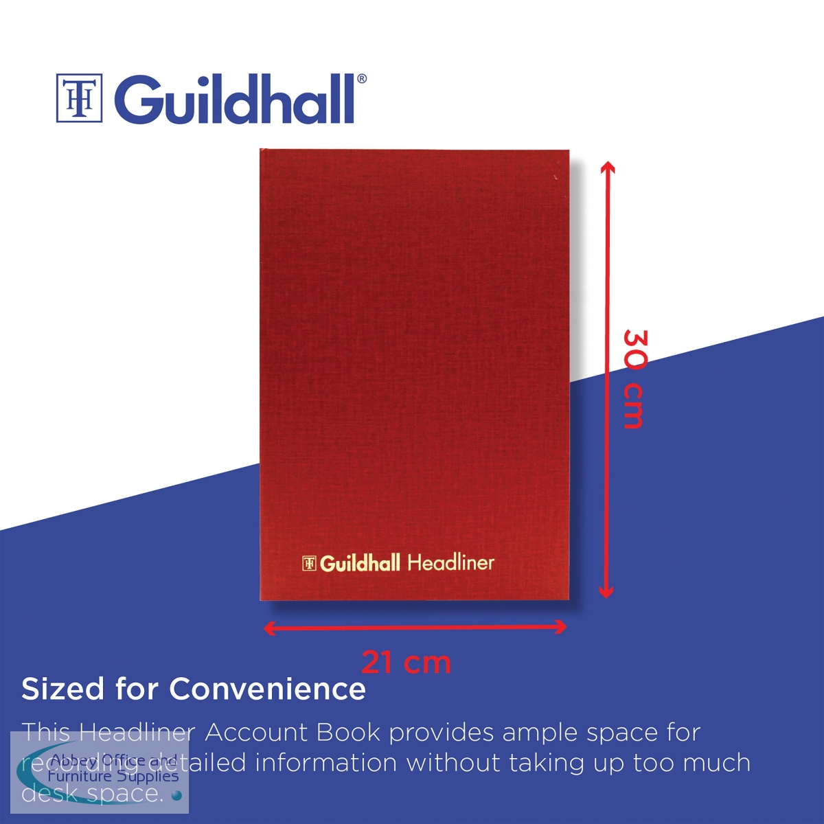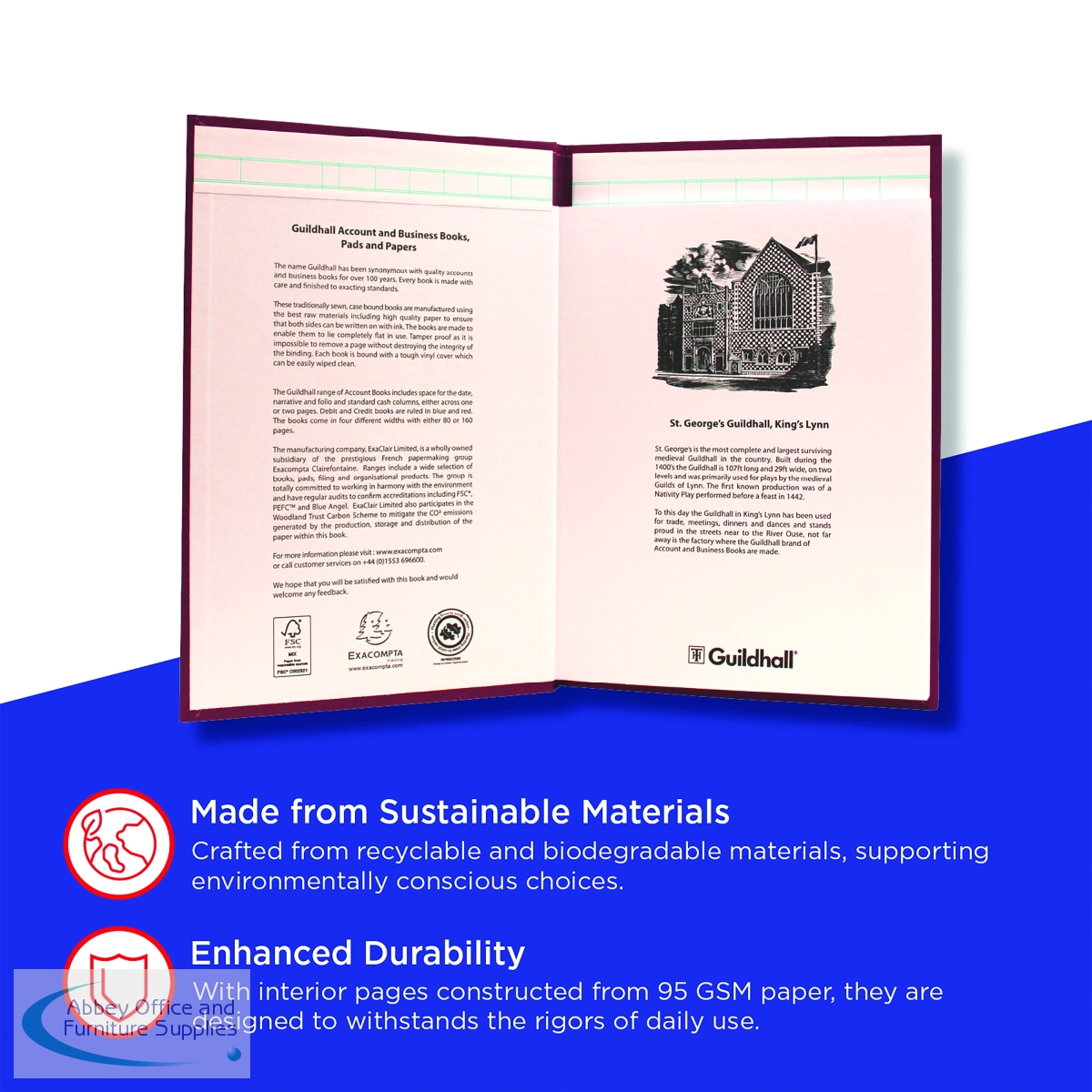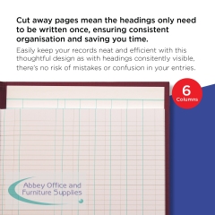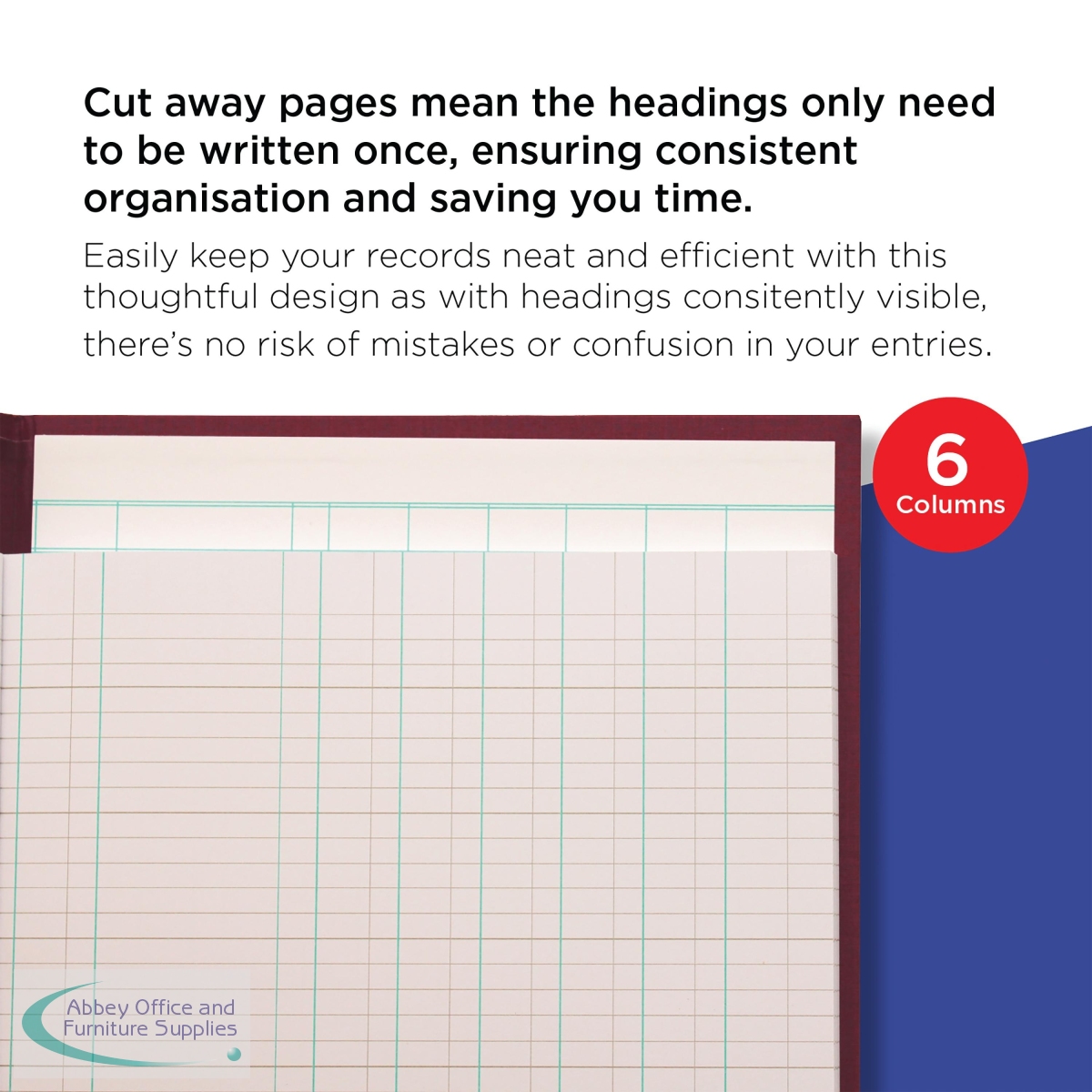 Ideal for accounts with the same headings on every page, the 80 page Exacompta Exacompta Guildhall Headliner 6 Cash Column Account Book has cutaway pages enabling to write out your headings once and have them show through on every page. This improves clarity and prevents errors in hand written accounts as the heading need only be written out once. Made from 95gsm ledger quality paper, each page is ruled with 6 cash columns across opening. The book is bound in a durable vinyl burgundy cover and has a sewn binding to prevent pages being removed.