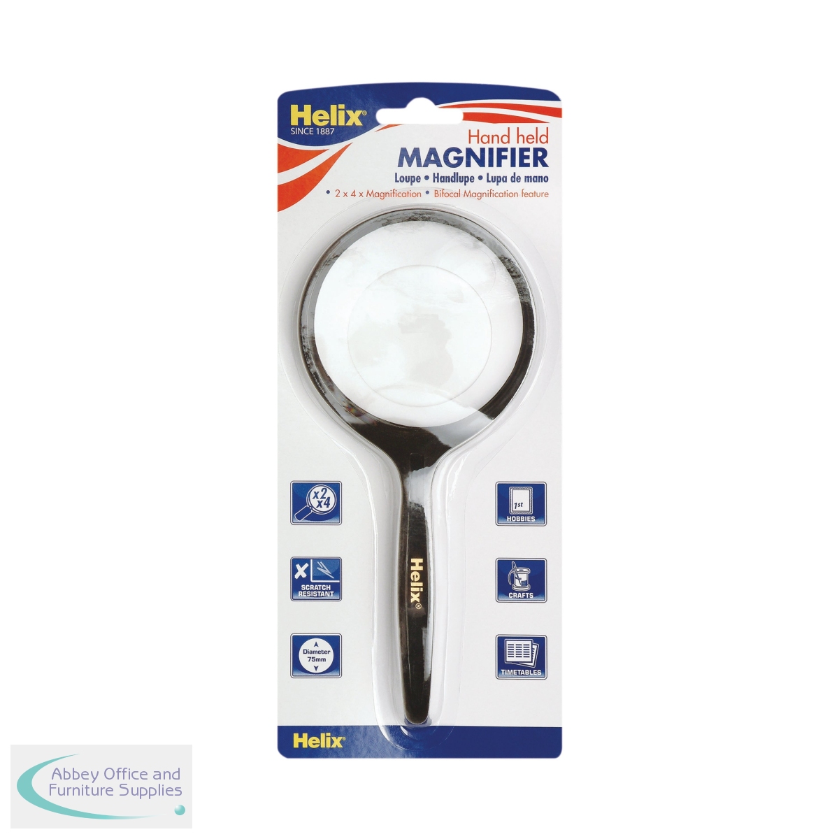 This Helix magnifying glass has a 75mm lens diameter, making it easy to hold and use in various crafts with its bifocal lens. This hand held magnifier is lightweight and has a scratch resistant lens, making this product stand the test of time against frequent use.
