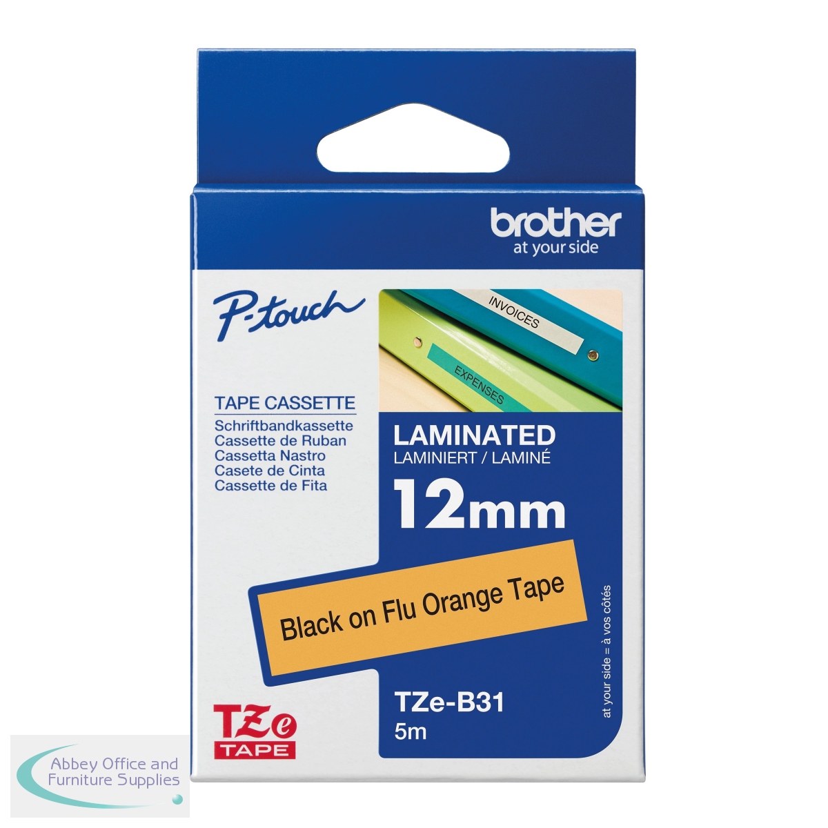 BA69162 - Brother P-Touch TZe Lam Tape Cassette 12mm x 8m Black on Fluorescent Orange Tape TZEB31