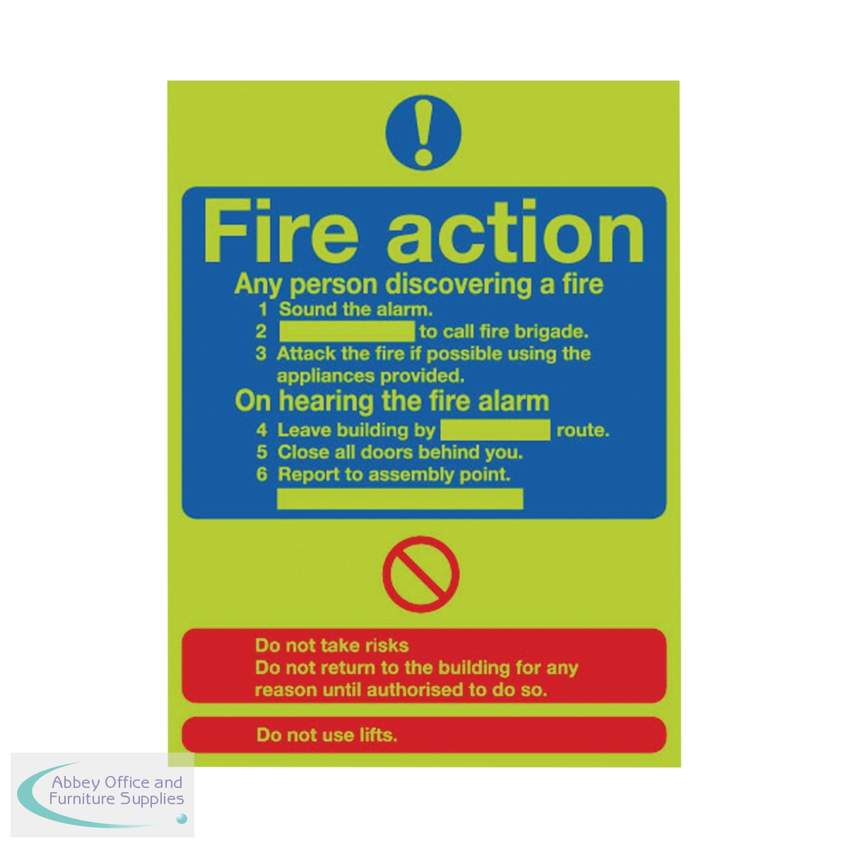 This luminescent sign is designed for both light and dark environments and details safety procedures in the event of a fire, leaving no confusion in an emergency. This sign is designed to comply with health and safety regulations, keeping visitors, customers and employees informed. This rigid PVC sign measures 300x250mm.