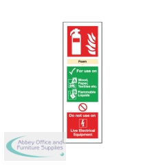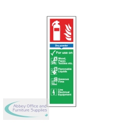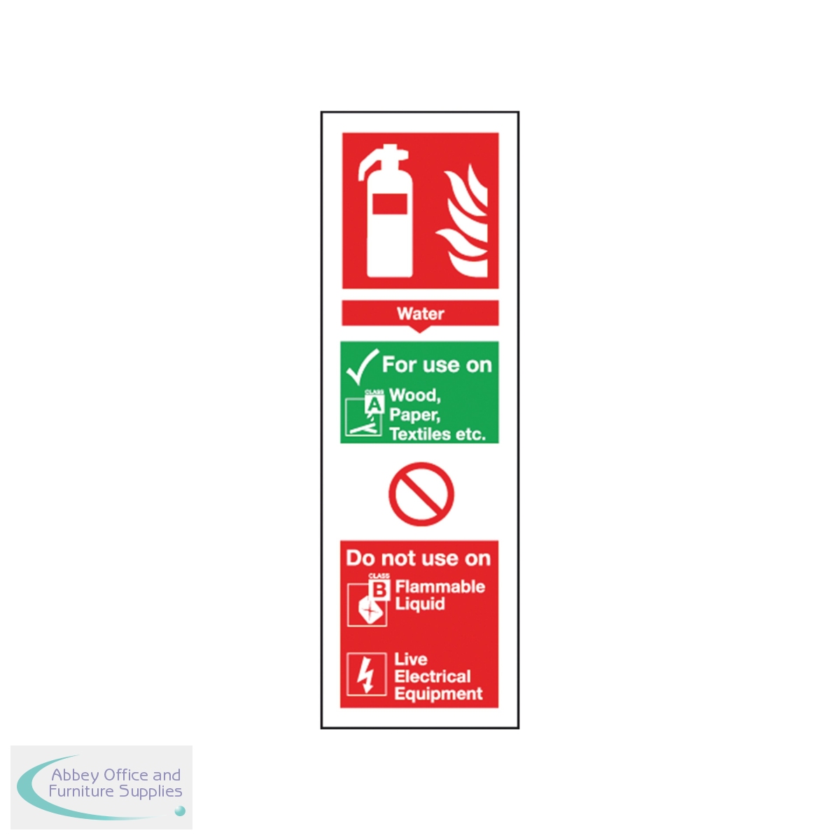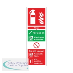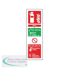 This sign details safe applications for water fire extinguishers. Simple to understand, using recognisable symbols and a universal colour scheme, this sign keeps employees, customers and visitors informed in the event of a fire. This self-adhesive sign measures 300 x 100mm.