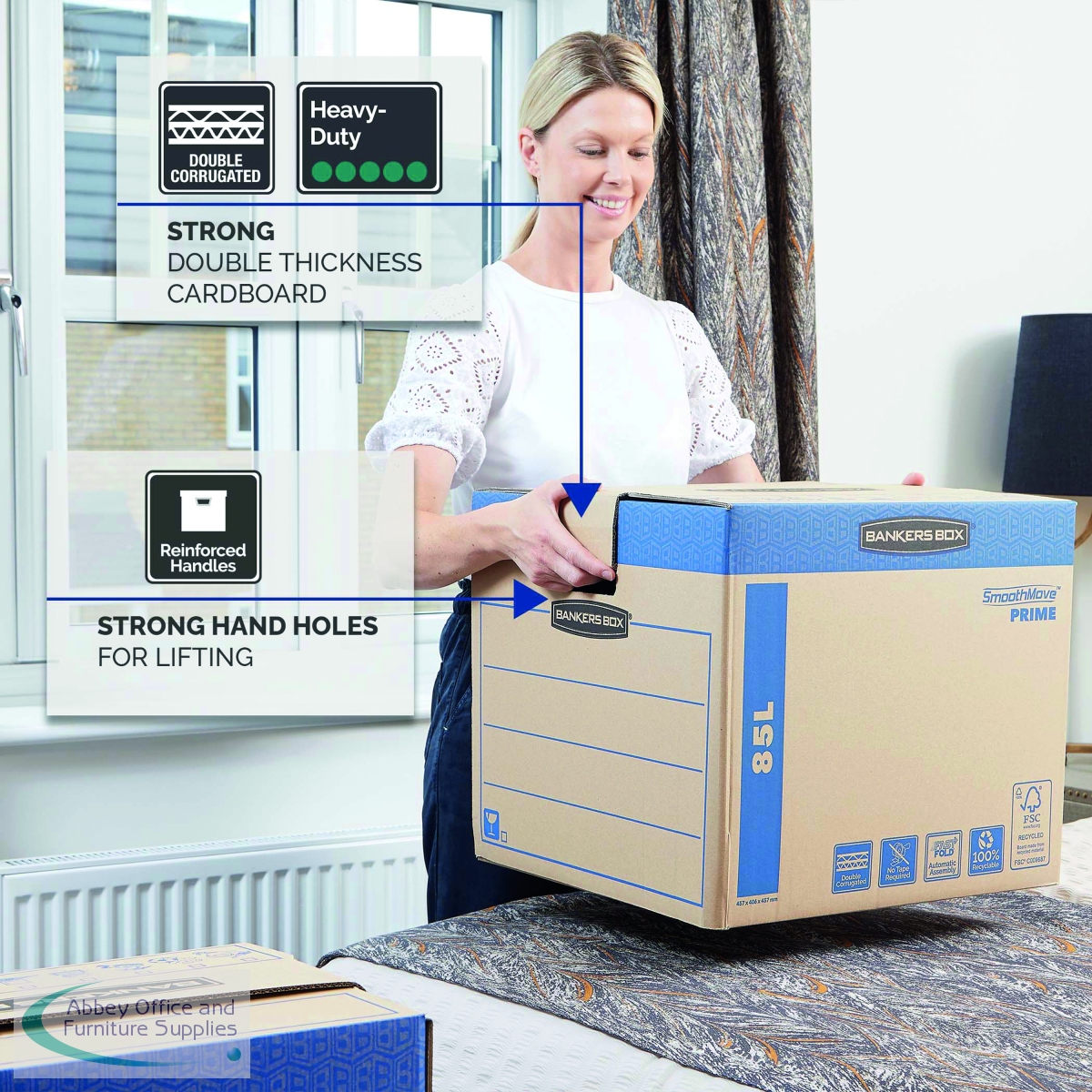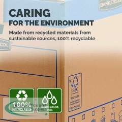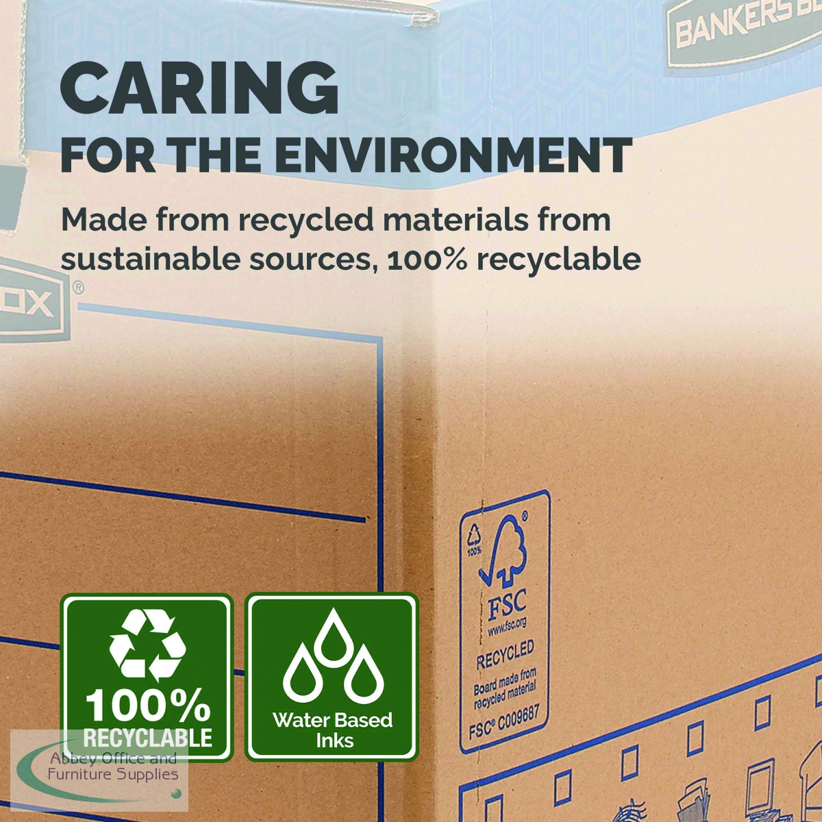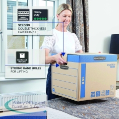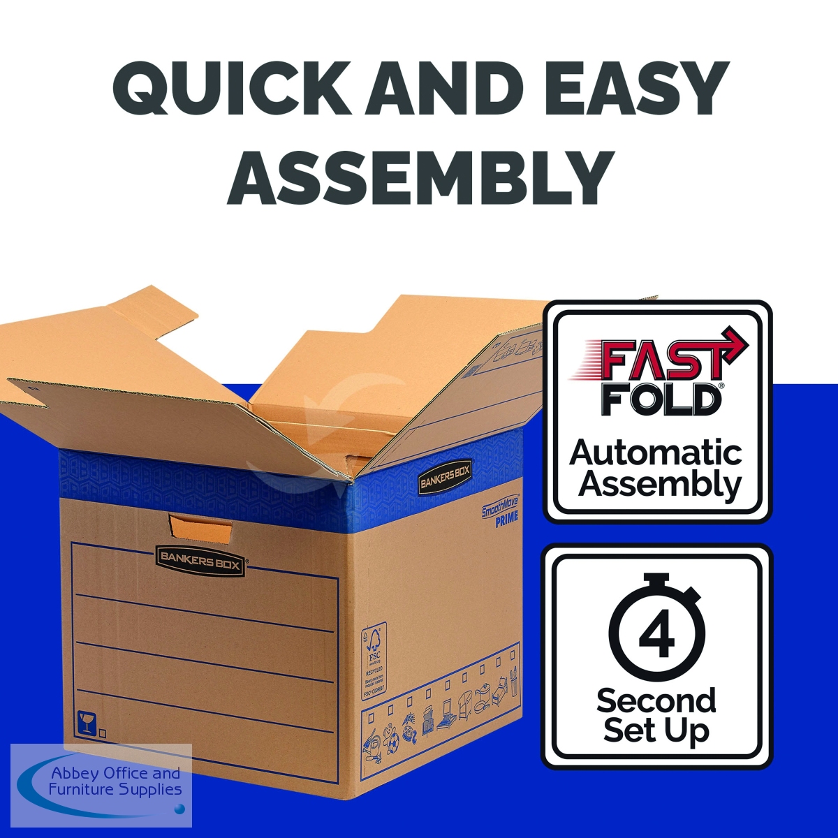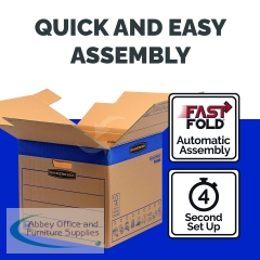 Fellowes Bankers Box SmoothMove Fastfold Removal Box is an environmentally friendly, reusable box made from strong double thickness corrugated board. It features Fastfold automatic assembly for your convenience. Each box has a secure locking lid and reinforced hand holes for easy storage, transportation and to protect the integrity of the contents. These large boxes come flat packed in a pack of 5.