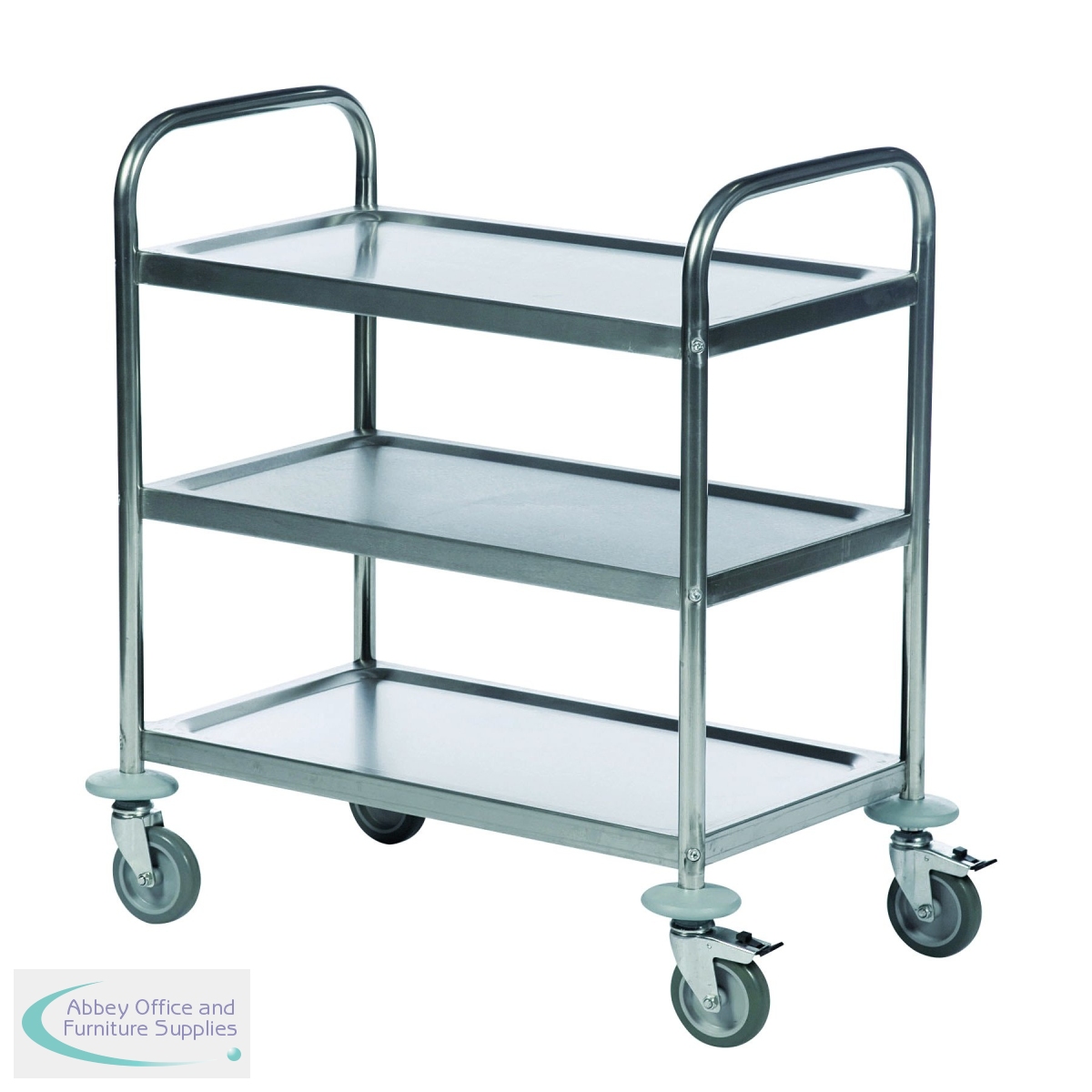 Transporting goods is made quick and easy by using this stainless steel three tiered economy trolley from Slingsbury. Manufactured from strong material it allows you to carry goods with very little effort and is mounted on rubber tyred swivel castors for fantastic flexibility of movement. The two pressed steel shelves offer great support and has a capacity of up to 100kg for holding heavy goods. This economy trolley comes in a flat pack and is quick and easy to assemble.