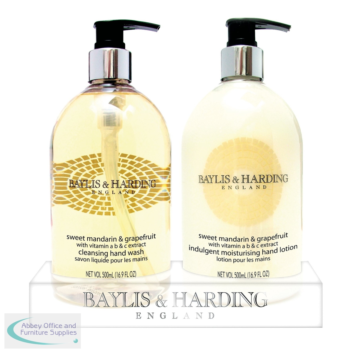 This Baylis & Harding pack contains a hand wash and lotion that are a sweet smelling combination of natural fragrances and vitamins A, B & C. This exquisite set of hand lotion and hand wash enriches and pampers your skin to leave you feeling revived and revitalised. Well presented and with a beautifully fragrant sweet mandarin and grapefruit scent, the hand wash and lotion come complete with an easy dispensing pump, making them ideal for washrooms, hotels or the home for that little extra luxury. This twin pack includes a 500ml bottle of hand wash and a 500ml bottle of hand lotion.