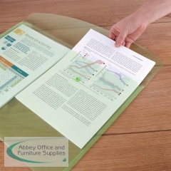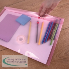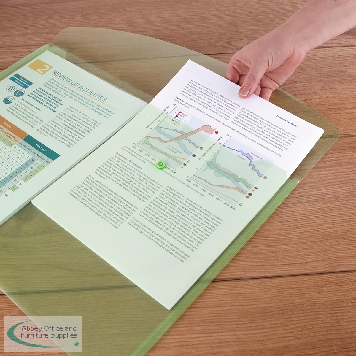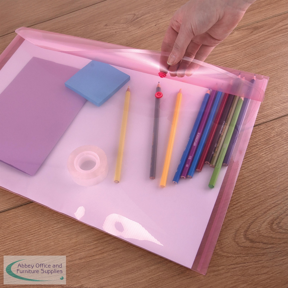 A3 size Popper Wallets made from durable recycled polypropylene sheet material. Featuring a colour-coordinated press-stud closure on the curved, fold-over flaps, these folders keep contents safe and secure, making them useful as a general storage file for holding loose papers together at the office, home, or on the move. Featuring a handy pen holder cutout under the curved flap and a large capacity of 75 sheets of 80 gsm paper, up to A3 in size, these files come in convenient packs of 5.