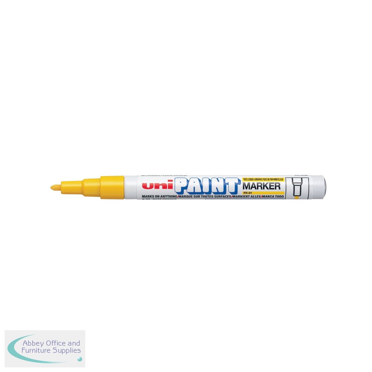 This UniPAINT marker contains permanent ink that is both water and fade proof. Suitable for use on a variety of different surfaces including metal, wood, plastic, glass and stone, the vibrant ink provides a glossy finish ideal for signs, displays and more. The fine bullet tip writes a line width of 0.8-1.2mm. Ideal for writing on dark surfaces, this pack contains 12 yellow markers.