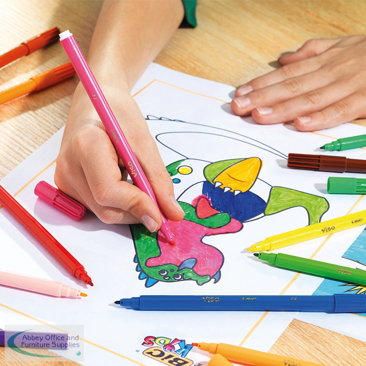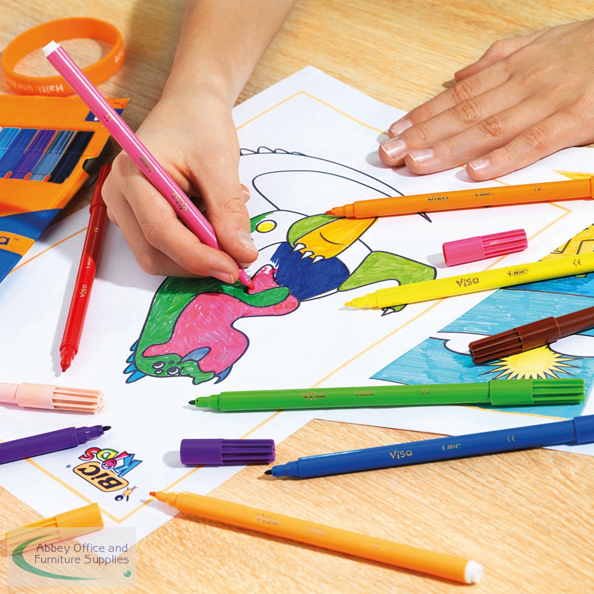 Ideal for classroom use, these Bic Kids Visa Felt Pens feature an ultra fine tip for detailed drawing and colouring. The pens contains water based ink, which is washable from most fabrics. This bulk pack contains 36 felt pens in vibrant assorted colours.