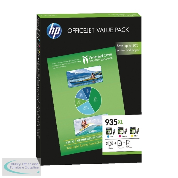 Ideal for small businesses, this Officejet Value Pack has everything you need for consistent, professional quality printing. Containing three colour inkjet cartridges in cyan, magenta and yellow, as well as 50 sheets of HP All-In-One A4 printing paper and 25 sheets of HP Professional Matte A4 inkjet paper, the pack provides prints that dry fast and last for decades. Key Features