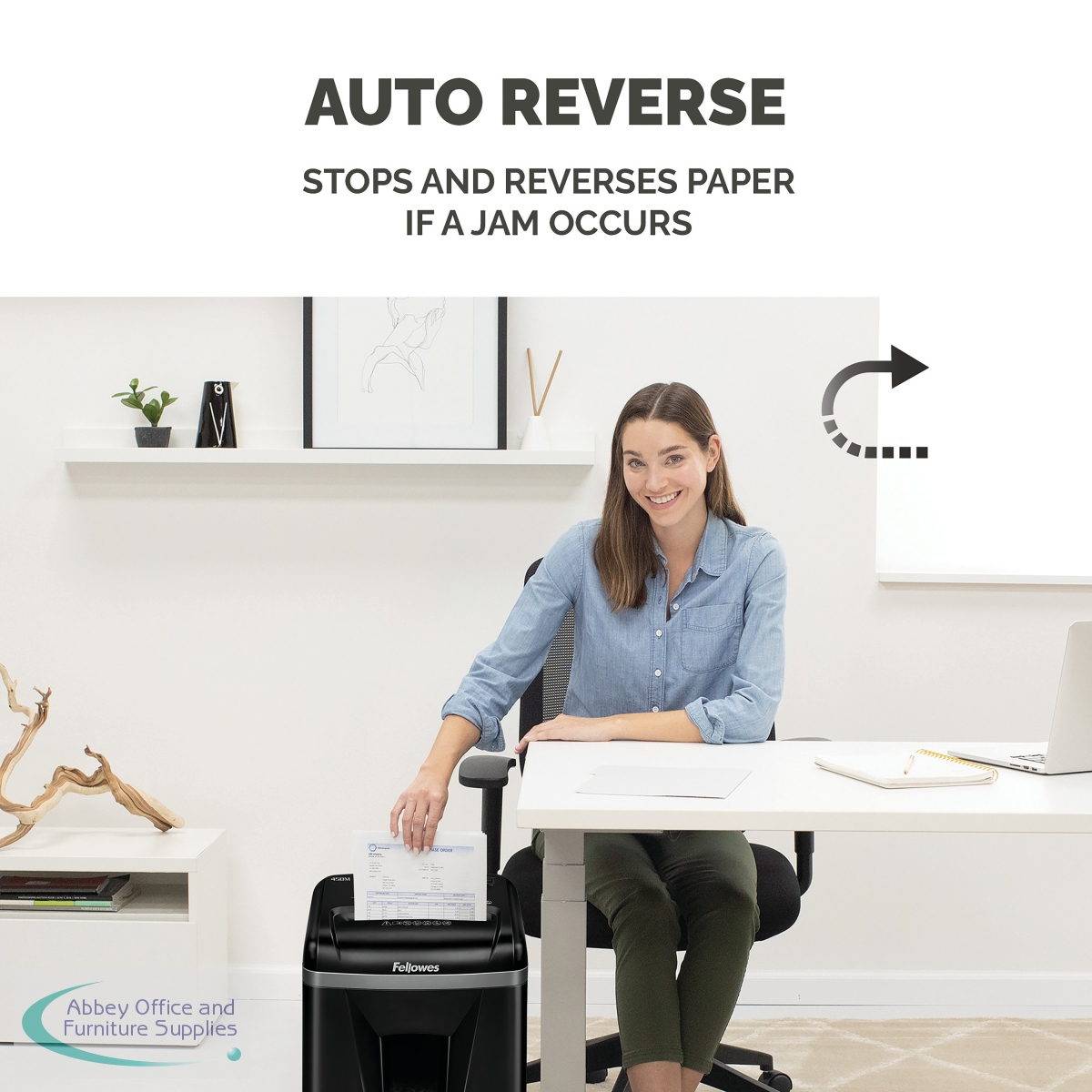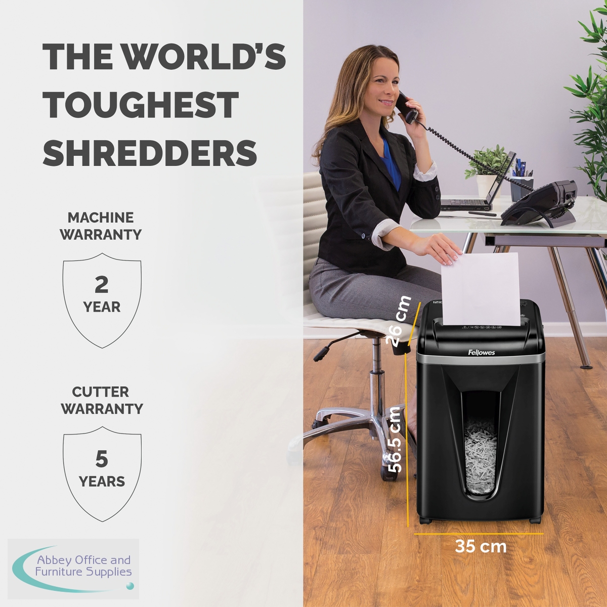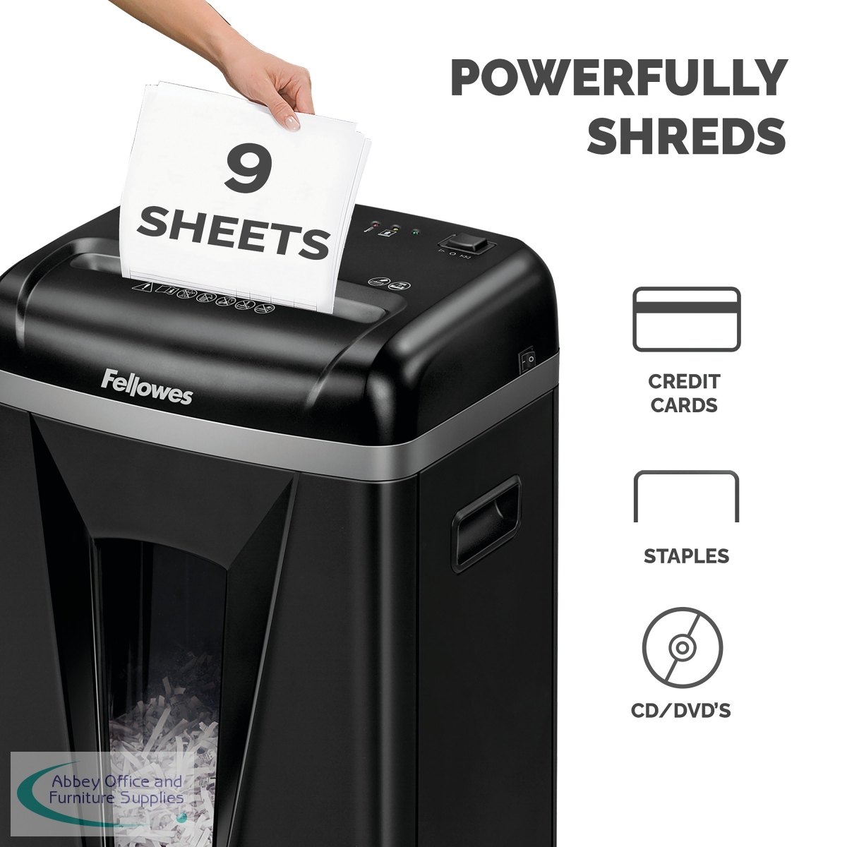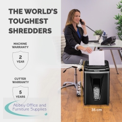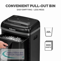 The Fellowes 450M Micro Cut Shredder has a P-5 security level, shredding up to 9 sheets at a time into 2 x 12mm micro-cut particles. With ultra quiet SilentShred peformance and an auto-reverse function, which stops and reverses paper if a jam occurs, the 450M provides efficient, reduced noise shredding. With a large 22L bin, the 450M can also shred staples, CDs/DVDs and credit cards. This black shredder measures W351 x D260 x H565mm.