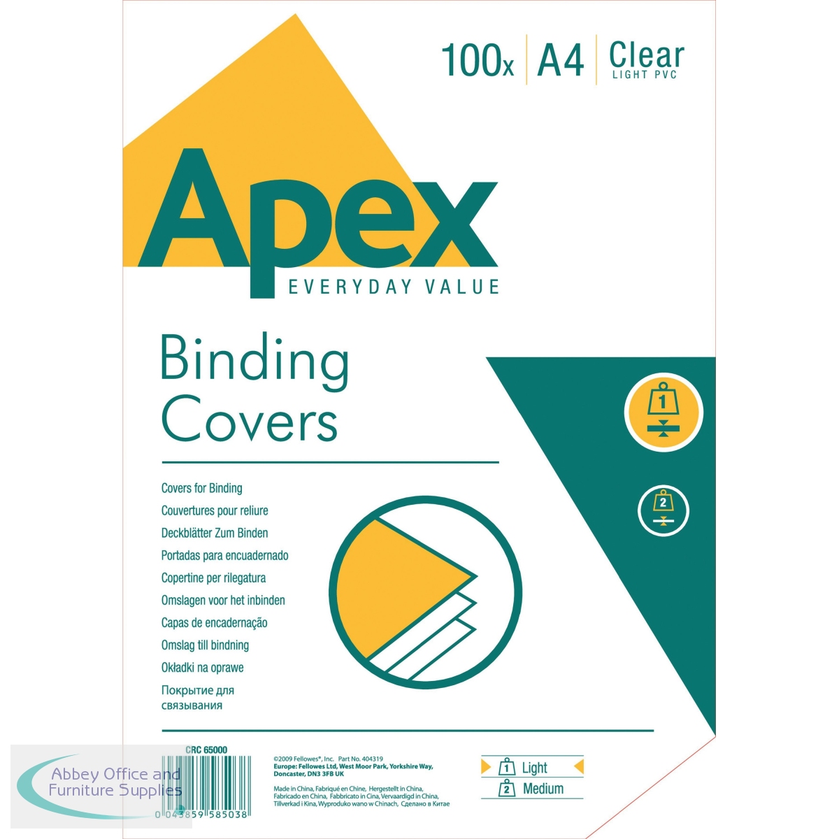 Fellowes Apex Clear Lightweight PVC Covers are for use with various binding methods, including wire, coil, and comb binding. These transparent covers display the first printed page, leaving you free to create your own title page. The lightweight 140 micron covers ensure pages stay protected to preserve the professional appearance of your documentation. Sized to A4, these covers fit quickly and easily to your documents without the need for trimming.