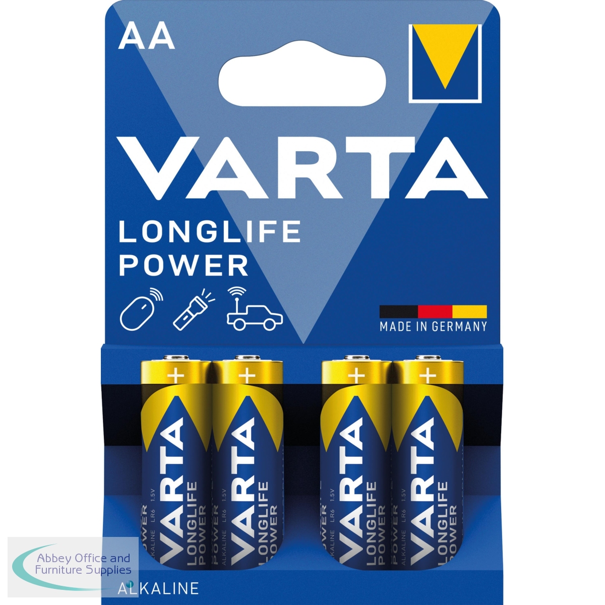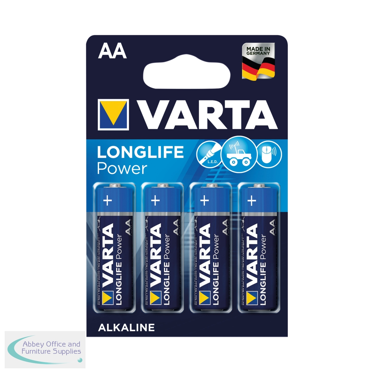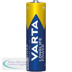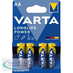 Varta Longlife Power AA Battery (Pack of 4) 4906121414. Varta Longlife Power is developed especially for devices with high energy consumption. Powerful energy for power-hungry devices, e.g. battery-operated toys, wireless mouse, flashlights etc. Guaranteed storage time of 10 years. Innovative new cell design and unique matt label finish for a premium haptic appearance. Made in Germany - made to last, VARTA brand quality ensured. Chemical System: Primary Alkaline Manganese. Voltage: 1.5V. Pack of 4.