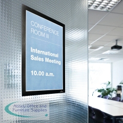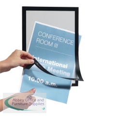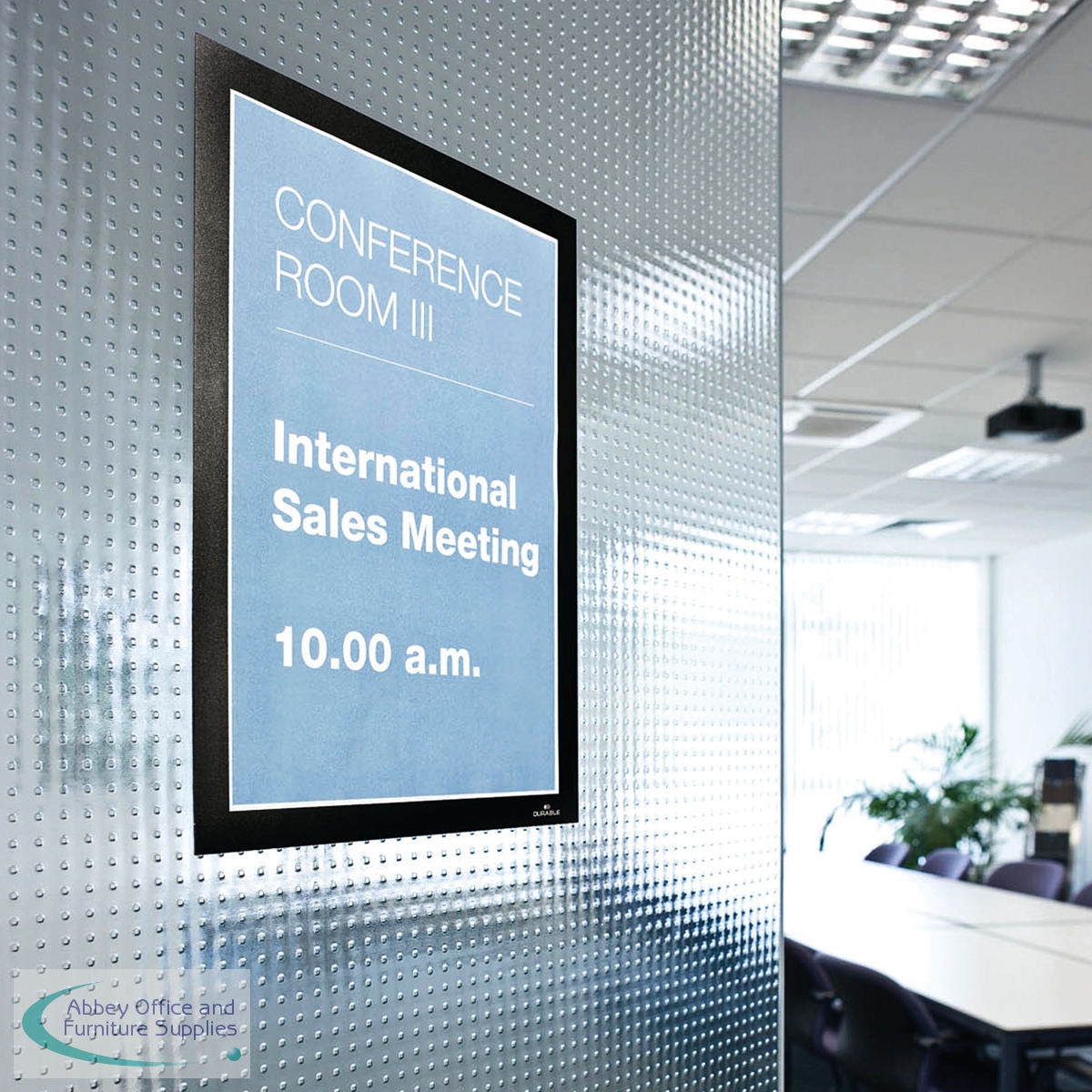 The self-adhesive info frame DURAFRAME is the ideal solution for displaying information on solid and smooth surfaces. The inserts can be quickly exchanged thanks to the magnetic fold-back frame. When applied to glass, the information can be read from both sides and will leave no residue when removed. Perfect for displaying notices, signage, safety information in any workplace or at home.