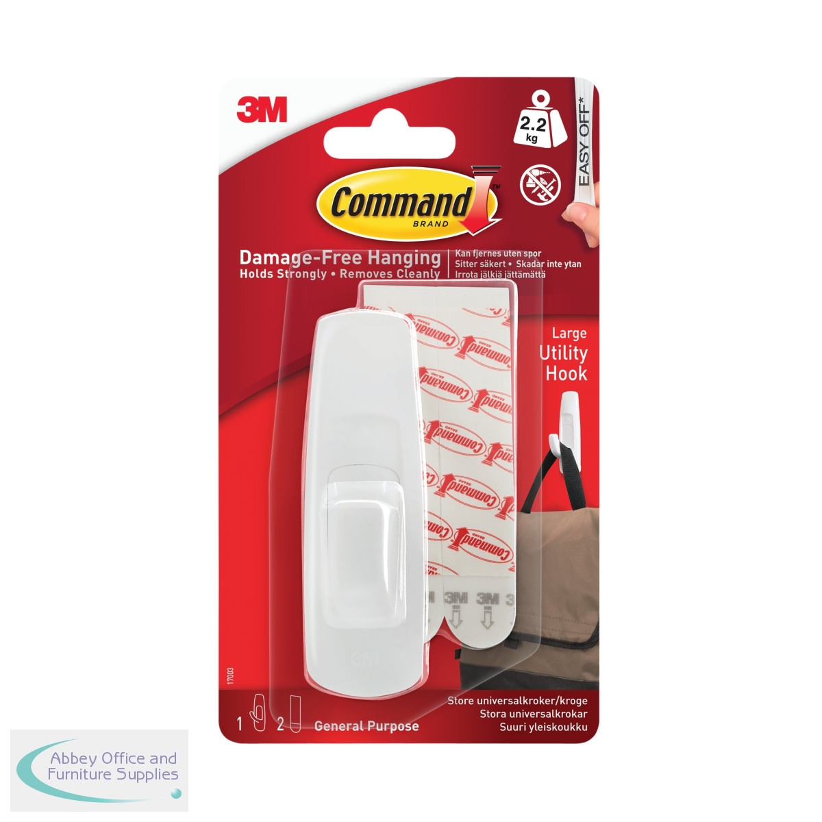 These 3M Command Adhesive Hooks provide a damage free hanging solution for the home and office. No need for nails or screws, the simple and easy to apply adhesive hooks hold strongly and remove cleanly. For use on finished wood, tile, metal, painted surfaces and more, these large hooks are great for hanging coats, bags, keys and much more. This pack contains 1 white large hook with 2 adhesive strips.