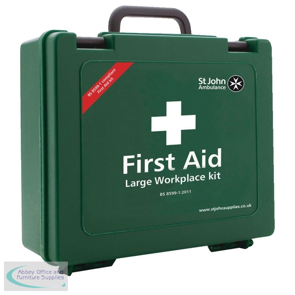 For workplaces with 100 employees, this St John Ambulance First Aid Kit contains 8 x medium dressings (120 x 120mm), 2 x large dressings (180 x 180mm), 4 x triangular bandages, 4 x finger dressings, 2 x conforming bandages (75 x 45mm), 4 x No.16 eye pad, 3 x foil blankets, 2 x Burnshield® dressings, 2 x Revive-Aid, 100 x washproof plasters, 40 x sterile cleansing wipes, 24 x safety pins, 1 x roll of microporous tape 22.5mm x 10m, 12 x pairs of nitrile powder free gloves and 1 x pair of Tuff Kut scissors. The kit comes in a durable moulded plastic case with a carry handle and comes with a bracket for wall mounting. This kit complies with British Standard BS-8599-1:2011.