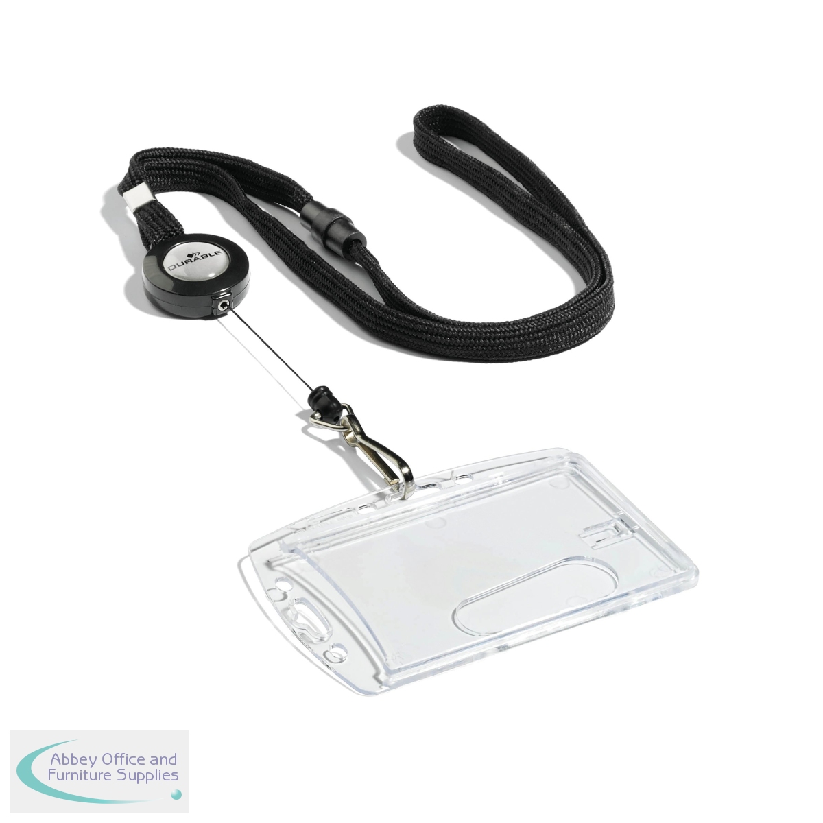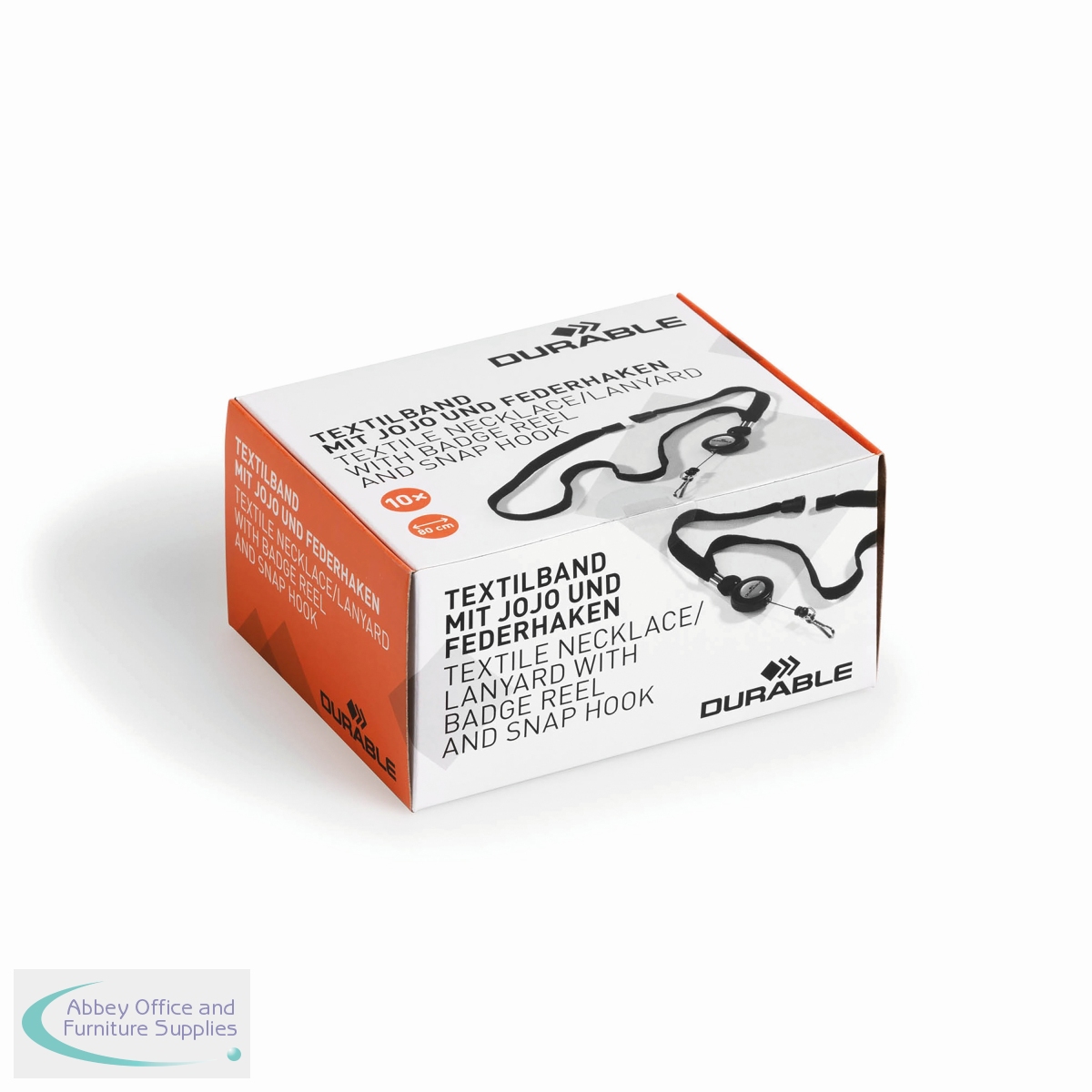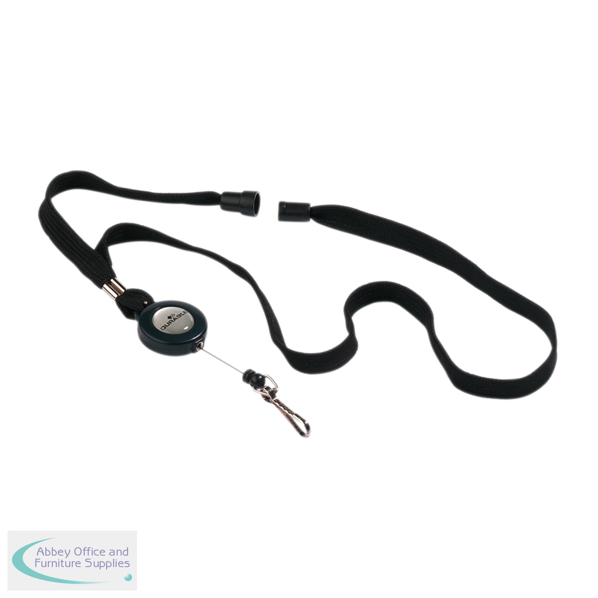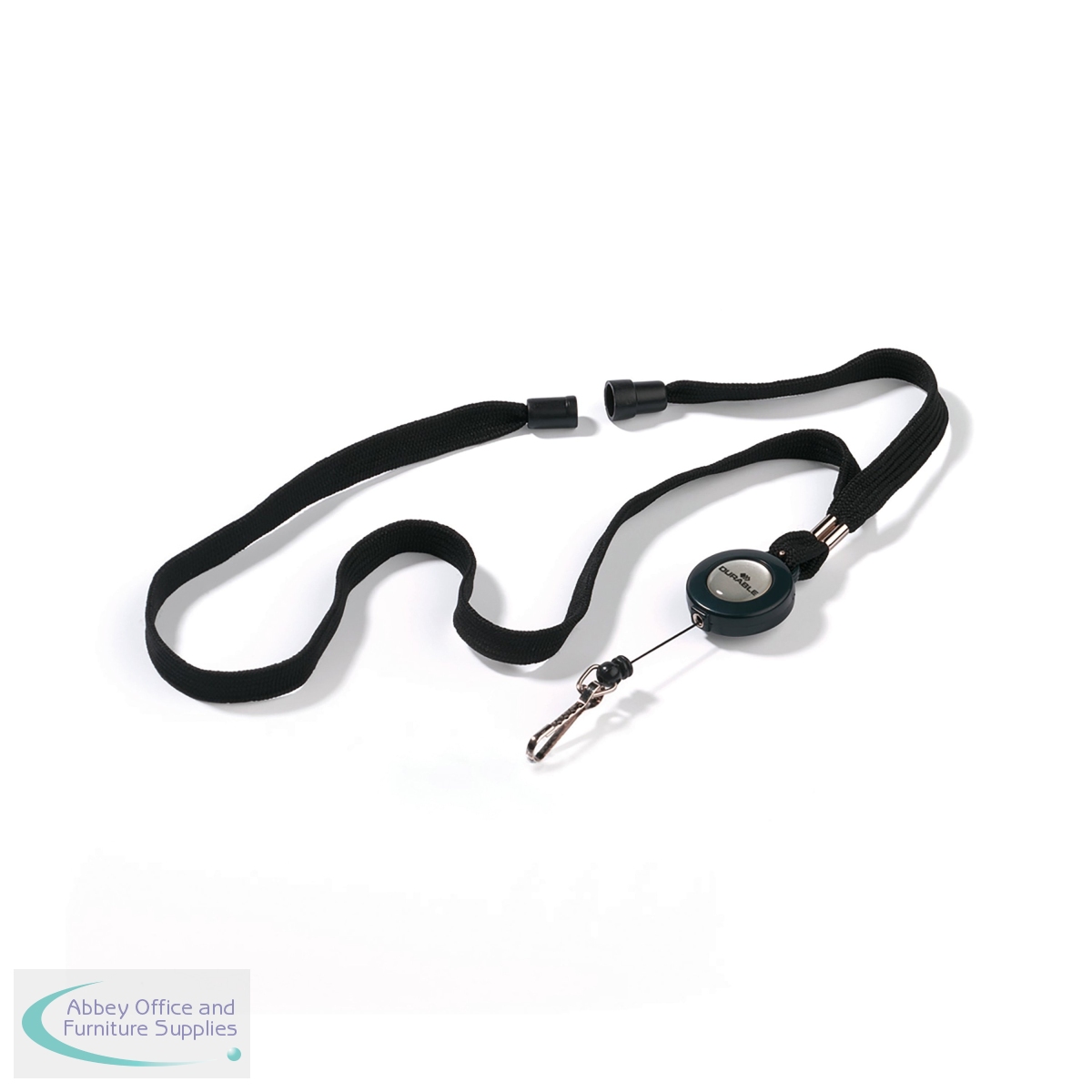 Durable Textile Lanyard with Badge Reel. The black lanyard can be combined with every DURABLE name badge with punched holes. The lanyard has a safety release which opens should the lanyard become trapped or caught. The length of the lanyard is 440mm, while the badge reel length is 850mm.