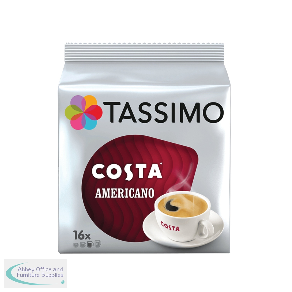 Enjoy a great tasting, professional cup of coffee with this pack of 5 Costa Americano Coffee capsules. Made from a specially crafted blend of beans roasted to perfection, allowing you to recreate a delicious cup of Costa coffee in your own home, or at work. Each pack contains sixteen 144g capsules compatible with Tassimo coffee machines.