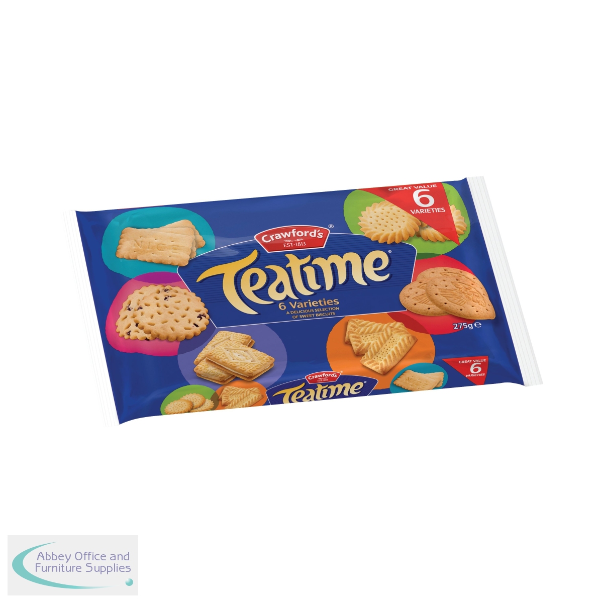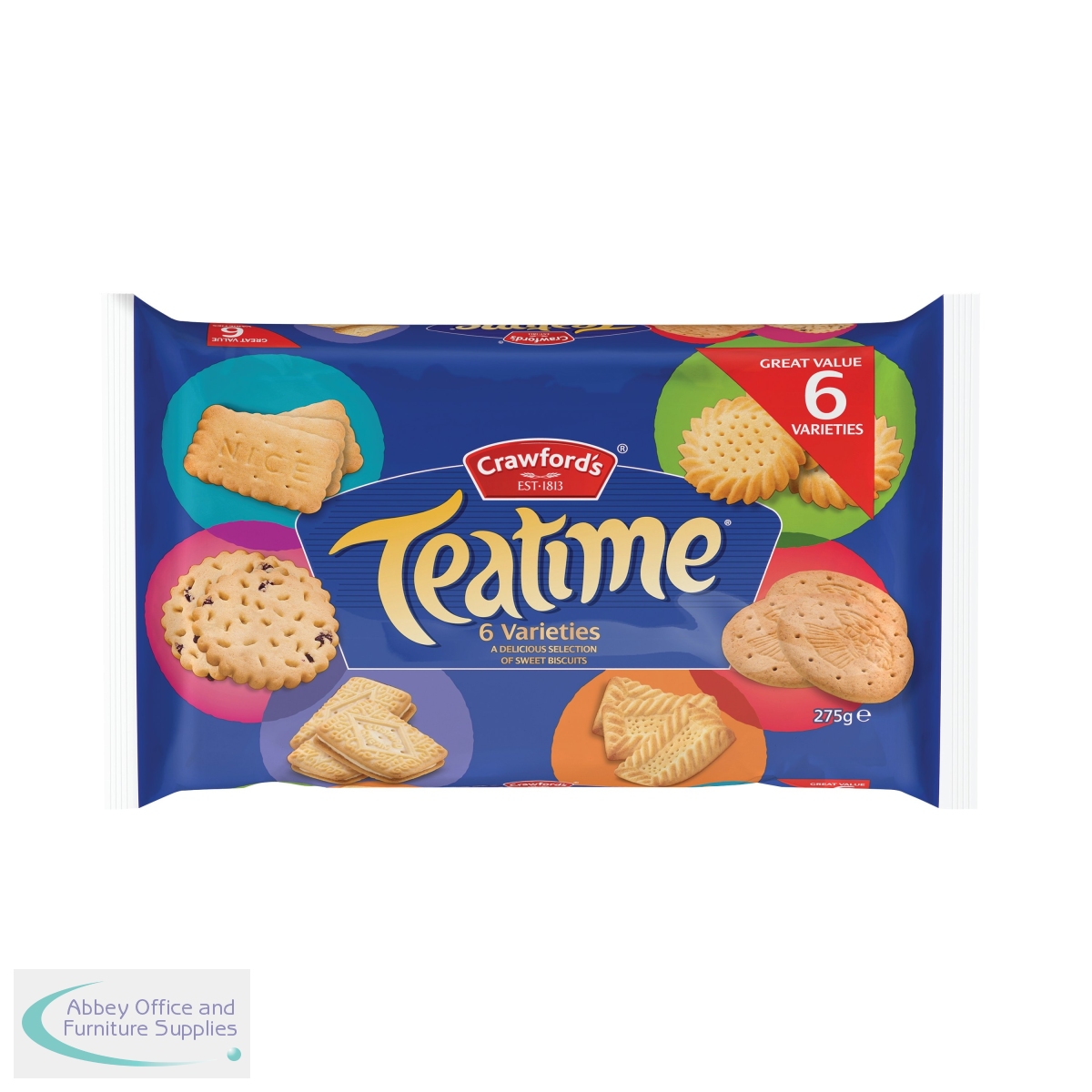 This Crawford's Teatime assortment contains a variety of popular biscuits including Custard Cream, Shortcake, Nice, Digestives, Fruit Shortcake and Golden Shortie. Great for sharing at home, or in the office, this 275g pack livens up a tea break and provides a delicious snack or treat any time of the day.